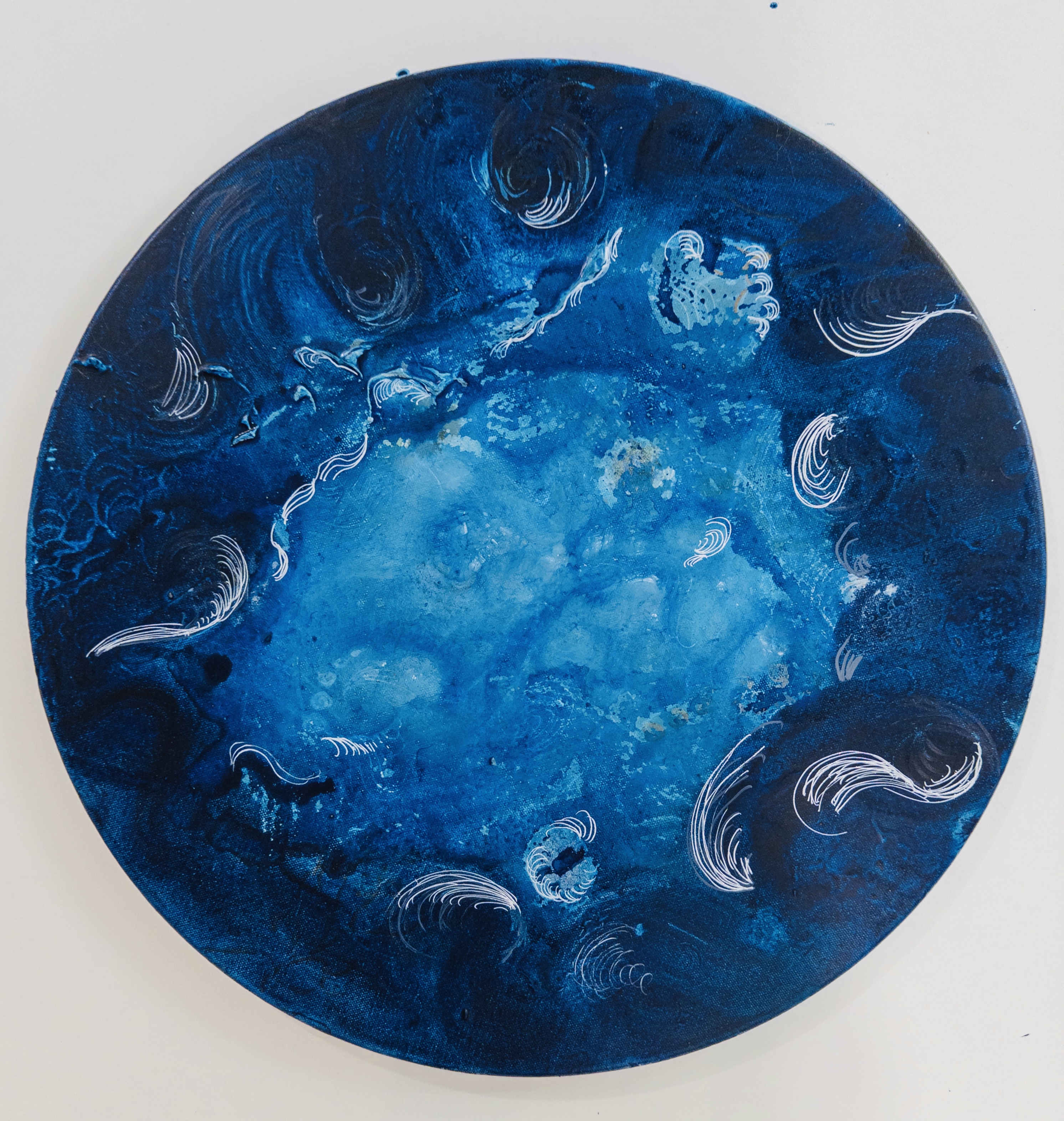 My painting series is inspired by the elements of Earth and beyond and its organic depth of color. I see inspiration in landforms from above, water’s transparency and movement, rocks and minerals and their multiple layers of colors. Many of the materials used in painting are derived from elements of the earth and I use these elements to build something abstract and yet symbolic of what our planet is made of. Circles also have a symbolic meaning of infinity, balance, returning cycles, and the cosmos. I am creating a story of our planet but most importantly a dialogue about climate change and what is infinite or finite. My paintings combine a mixed media of acrylic, oil, ink, and vinyl, spray paint, gold and bronze powder, mica, and melted plastic on linen canvas. We need to preserve our natural environment to create a more peaceful world.