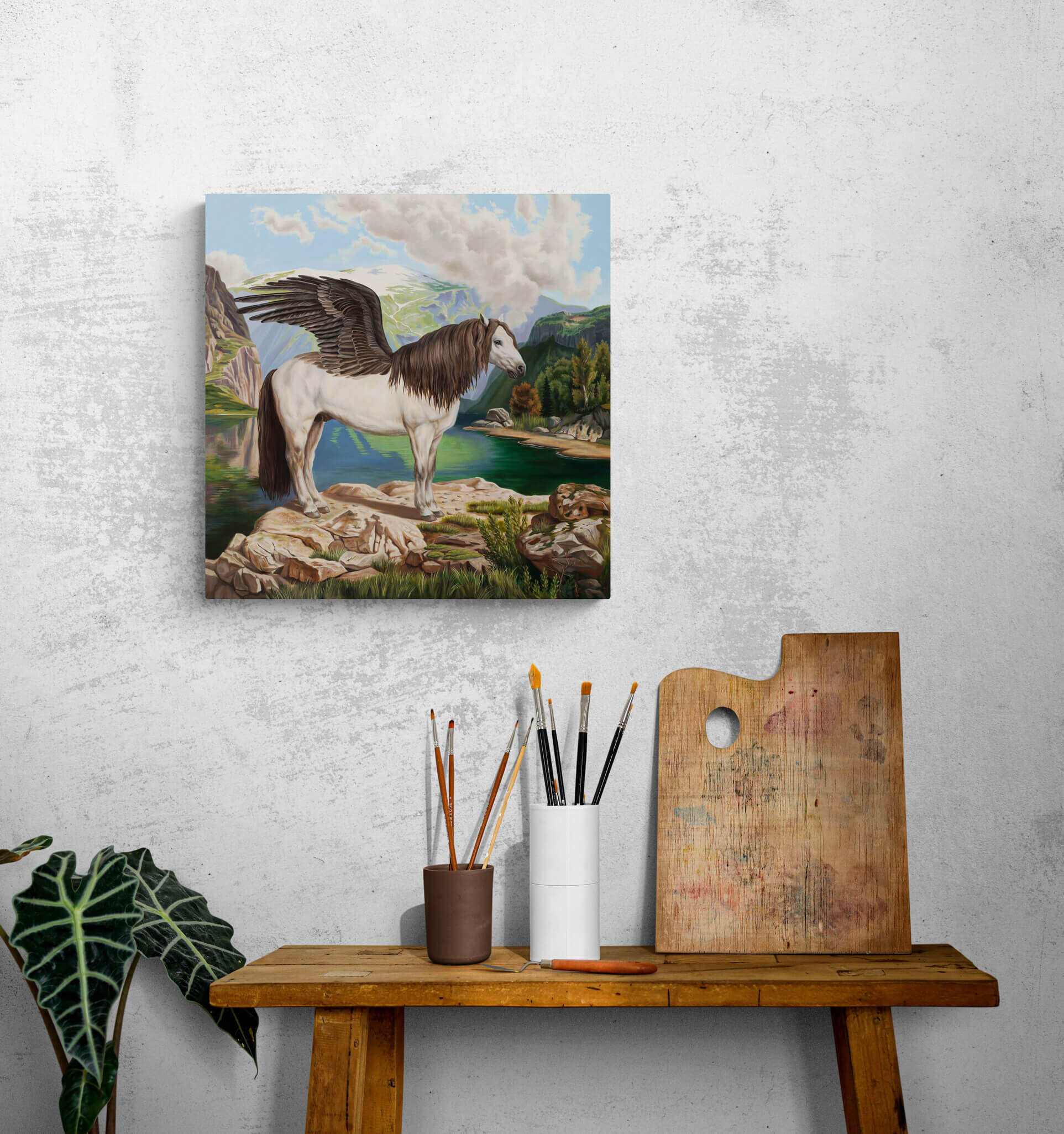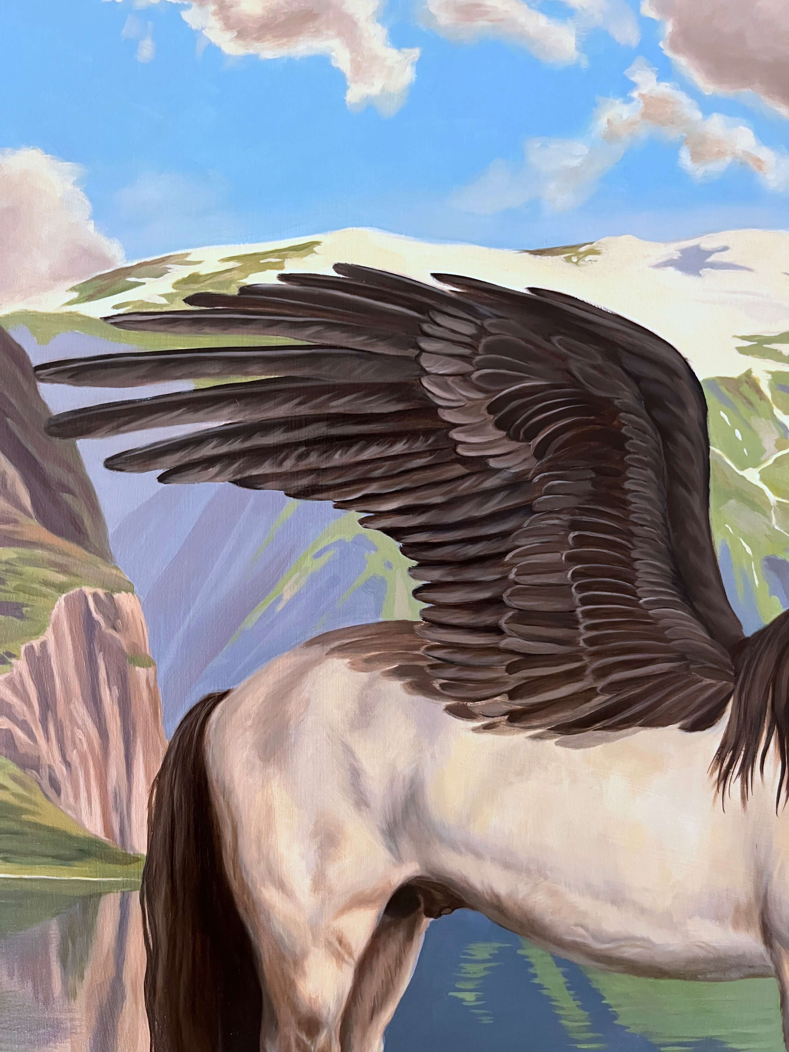 This painting is part of my "Magical Realism" series. I wanted to portray Pegasus from greek mythology. According to legend, Pegasus is the son of Poseidon and Medusa. To me, this is a balance of light and darkness. With that in mind, I added darker wings and hair to make this my own version of the legend that could combine light and dark elements.