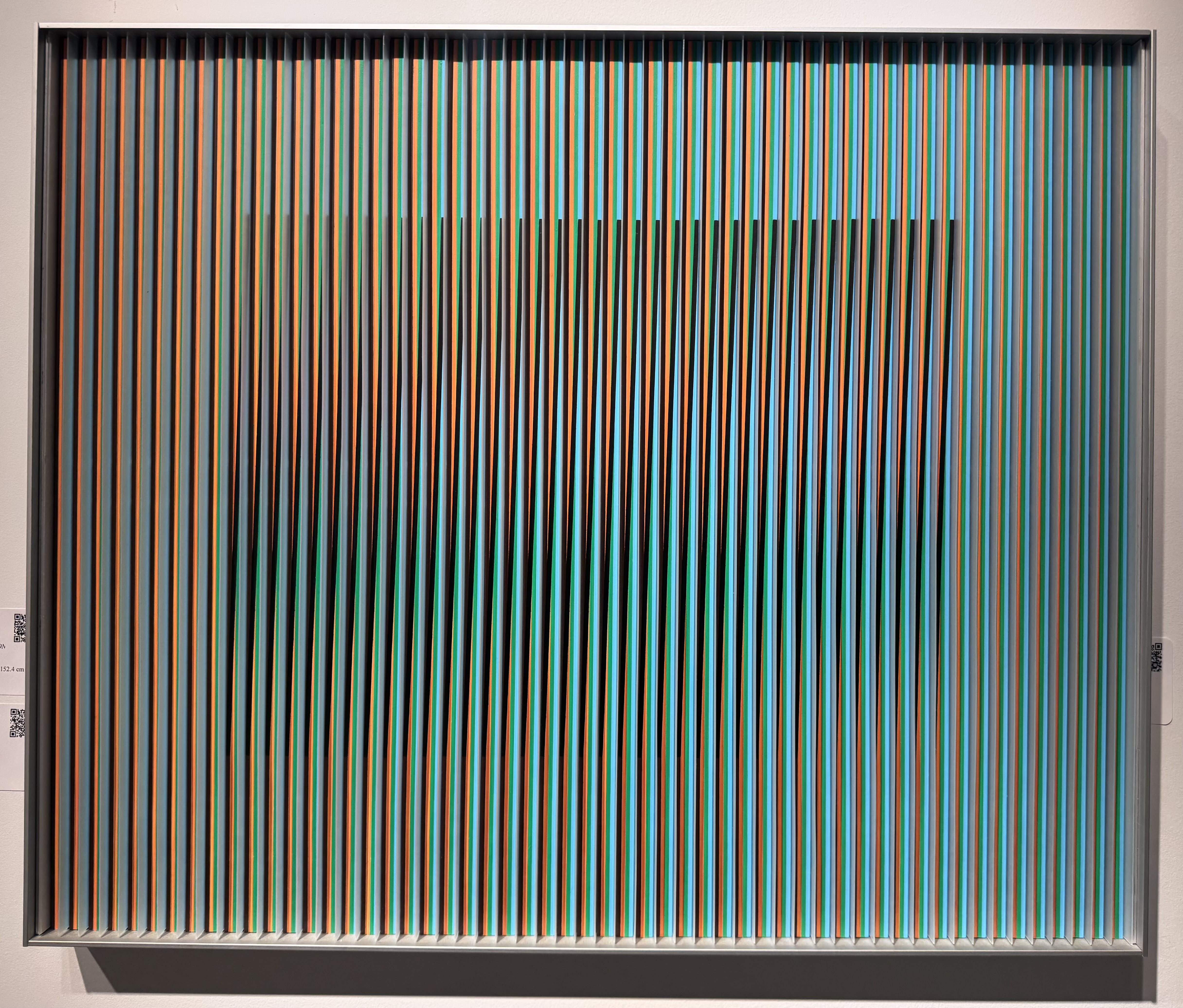 A Physichromie acts as a “light trap” in a space where a series of color frames interact; frames that transform each other, generating new ranges of colors not present on the support. Thus, the color fills the space confined between the vertical sheets — light-modulators — that cover the entire work. In addition, due to the effects of the viewer or light source, a series of color variations are created in them, similar to those observed in the real space of the landscape.