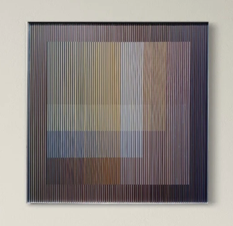 A Physichromie acts as a “light trap” in a space where a series of color frames interact; frames that transform each other, generating new ranges of colors not present on the support. Thus, the color fills the space confined between the vertical sheets — light-modulators — that cover the entire work. In addition, due to the effects of the viewer or light source, a series of color variations are created in them, similar to those observed in the real space of the landscape.