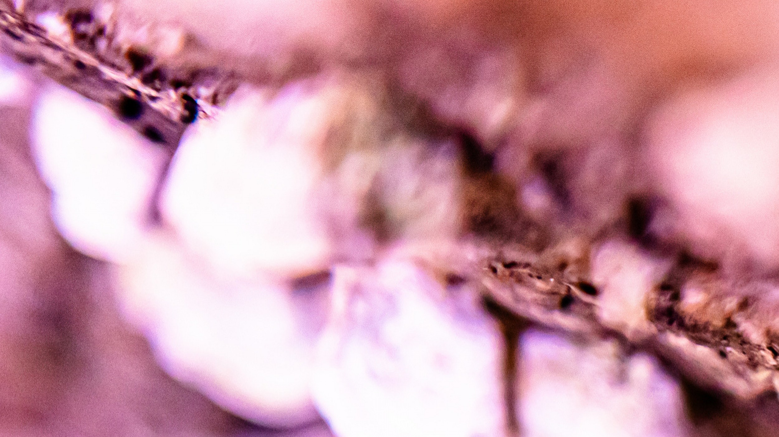 Delicate clusters of fungi emerge from the weathered bark of a Missouri tree, their soft pink and lavender tones turning the surface into a living tapestry of texture and light. A subtle blur lends the scene a dreamlike quality, focusing attention on the quiet persistence of beauty in unexpected places.