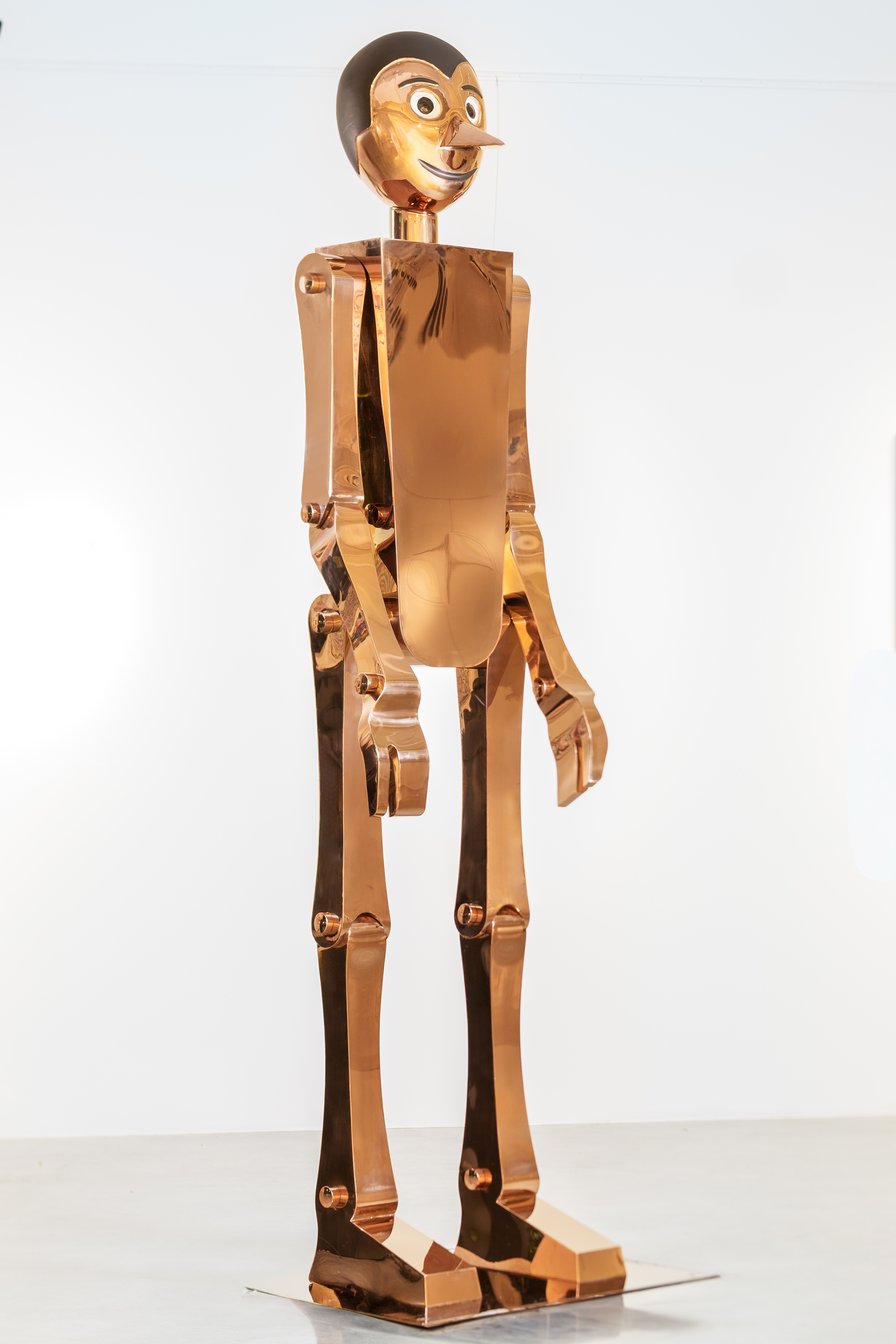 The metallic Pinocchio, which was chosen by the European Cultural Institute to participate in the Venice Biennale in 2019, uses the figure of the Italian puppet and the allegory of the novel by Carlo Collodi, to make the viewer reflect on global corruption today. The sculpture created in polished stainless steel was presented for the first time in the city of Buenos Aires during the last G-20 Summit right in front of the venue where the dignitaries of the participating countries were meeting. The Argentine artist represents the scandals of corruption in his country and the world, the incessant lies of politicians and rulers, fake news, global lies on social media, and the lie within the human being through the character of Pinocchio. The artist developed and designed a wooden Pinocchio in the first phase, which evolved into a 3D printer technology project. Initially, organic materials were used, and later, high-tech polymers were used, eventually progressing to an outdoor steel structure. The sculpture, made of polished stainless steel, is the first of its kind created with this technology by an Argentine artist.