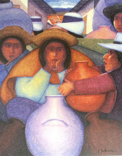 A leading Peruvian artist, Ernesto Gutierrez, was born in Lima, Peru, in 1941. His father was a Spaniard and his mother was a descendant of the Inca. Upon completion of his high school education, Gutierrez entered the School of Fine Arts in Lima, Peru, he received a Bachelor of Fine Arts Degree in 1964 and was awarded a Gold Medal. Sponsored by the Brazilian government, Gutierrez received the Itamarti Scholarship and studied for two years (1966-67) at the Museum of Modern Art in Rio de Janeiro while extensively exhibiting his works throughout the art centers of South America: Rio de Janeiro, Sao Paulo, Cordova, Santiago de Chile, and Lima, among others. In 1971, Gutierrez was granted a Fulbright Scholarship and studied at the University of Wisconsin where he received a Master of Fine Arts Degree in 1974. Gutierrez has been influenced by both local and global artistic factors: pre-Columbian forms and native-popular Peruvian art and also by modern French masters such as Cezanne, Gaugin, and to some extent, Matisse. The boldness of Gutierrez's colors creates an almost sensual excitement: shocking pink, chartreuse, mauve, and the whole gamut of blues, purples, and greens, often underlined and emphasized by complementary colors. In some of his paintings, Gutierrez assumes a cubist-realist simplification of forms and volumes and a precise rendering of surfaces. Gutierrez's sensibility strikes the viewer as essentially Spanish, while his inspiration derives from his Inca heritage, Peruvian landscapes, and folklore.
