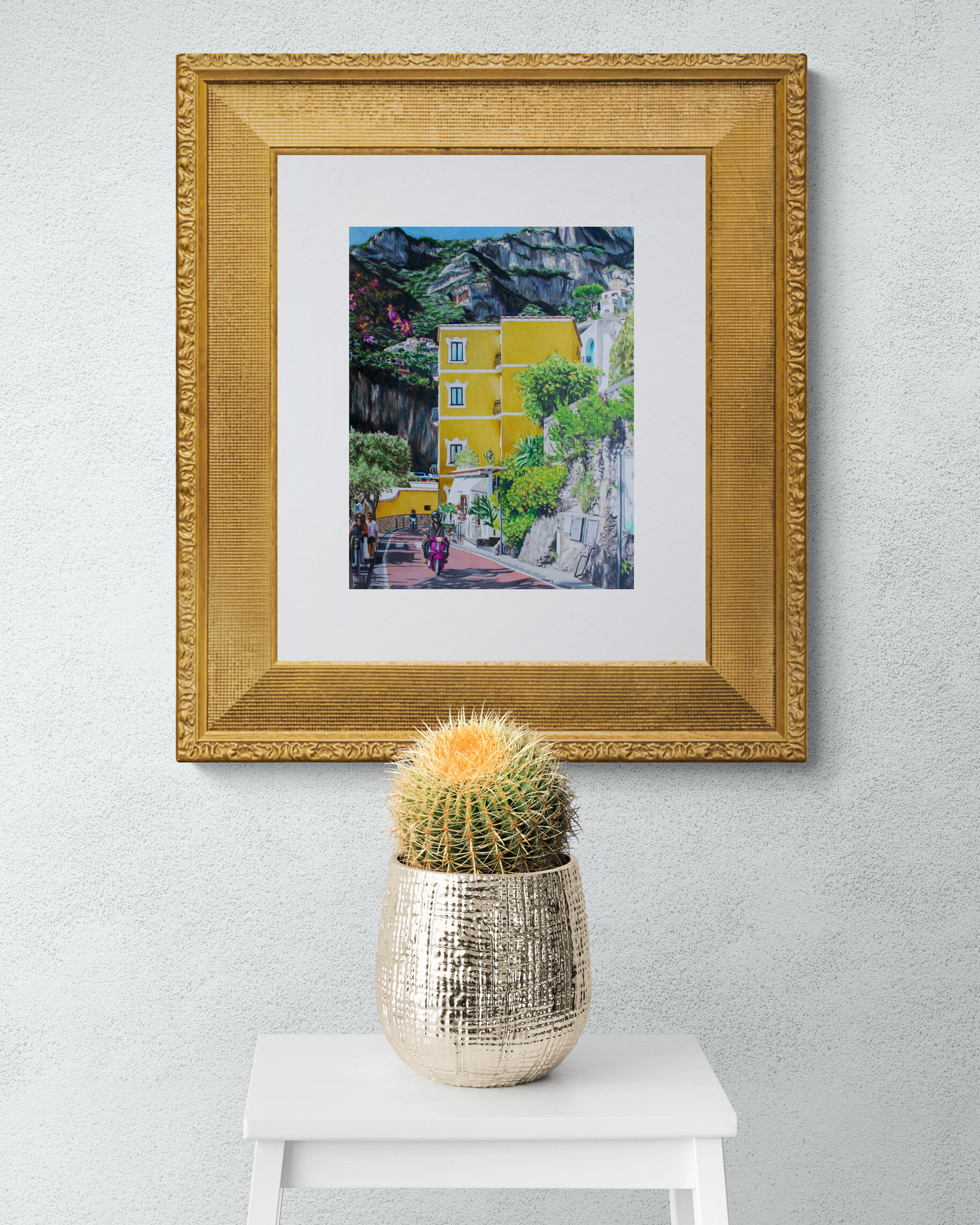 The work reflects not only the visual splendor of Positano but also the warmth and wonder of shared discovery — from mountain hikes to authentic margherita pizza and fresh lemon gelato enjoyed inside real lemons. Deely’s drawing invites viewers to experience the rhythm and vitality of the Amalfi Coast, transforming everyday walls into a window to Italy’s radiant coastline.