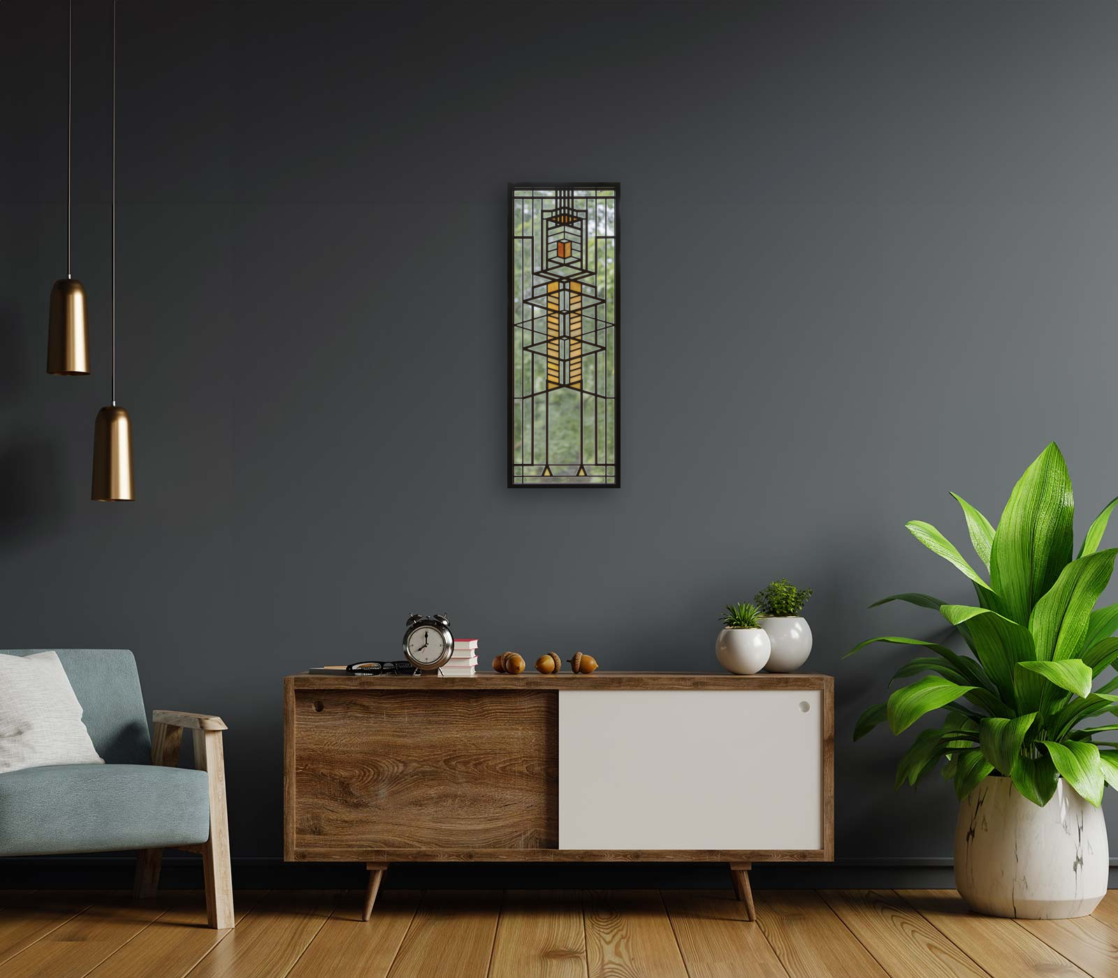 Produced under the auspices of the Frank Lloyd Wright Foundation. It is an exact replica of the Robie House No. 2 Window.
