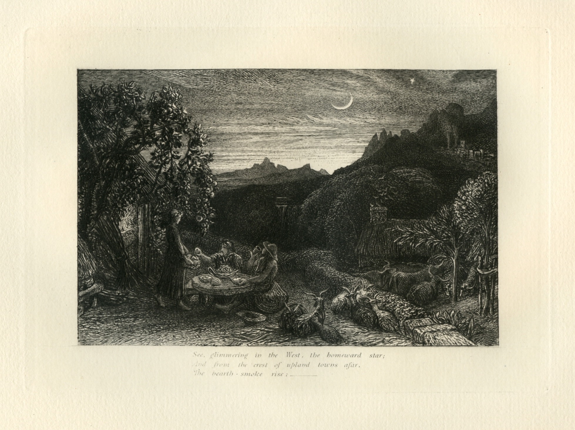 Medium: original etching. This impression on Alton Mill laid paper was printed in 1883 for "An English Version of the Eclogues of Virgil" and published in London by Seeley and Company. Samuel Palmer had planned a series of etchings to illustrate his translation of Virgil's Eclogues, but died in 1881 before finishing the project. The Homeward Star is one of four etchings left by the artist in an advanced state of completion, and the final details were finished by his son Alfred Herbert Palmer. Catalogue reference: Lister E14. Image size: 4 x 6 inches (100 x 152 mm). Plate size: 5 1/4 x 7 3/8 inches (133 x 189 mm). Sheet size: 8 1/4 x 12 5/8 inches (212 x 320 mm). Not signed.