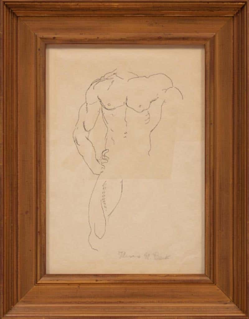 A rare ORIGINAL and authenticated pen-and-ink drawing with a fine provenance, and a wonderful drawing at that, by legendary American Scene artist Thomas Hart Benton. Though we are most familiar with his WPA-era paintings of rural Midwestern scenes, his drawings are less familiar - but they dramatically demonstrate his superb draftsmanship. The work as framed measures 19.5" x 15.25"; unframed, the artwork measures 14.5" x 10.25". Fine condition. Comes with a copy of a certificate of authenticity: provenance: Savor Gallery, New York, NY; Parke-Bernet Galleries, New York, NY.
