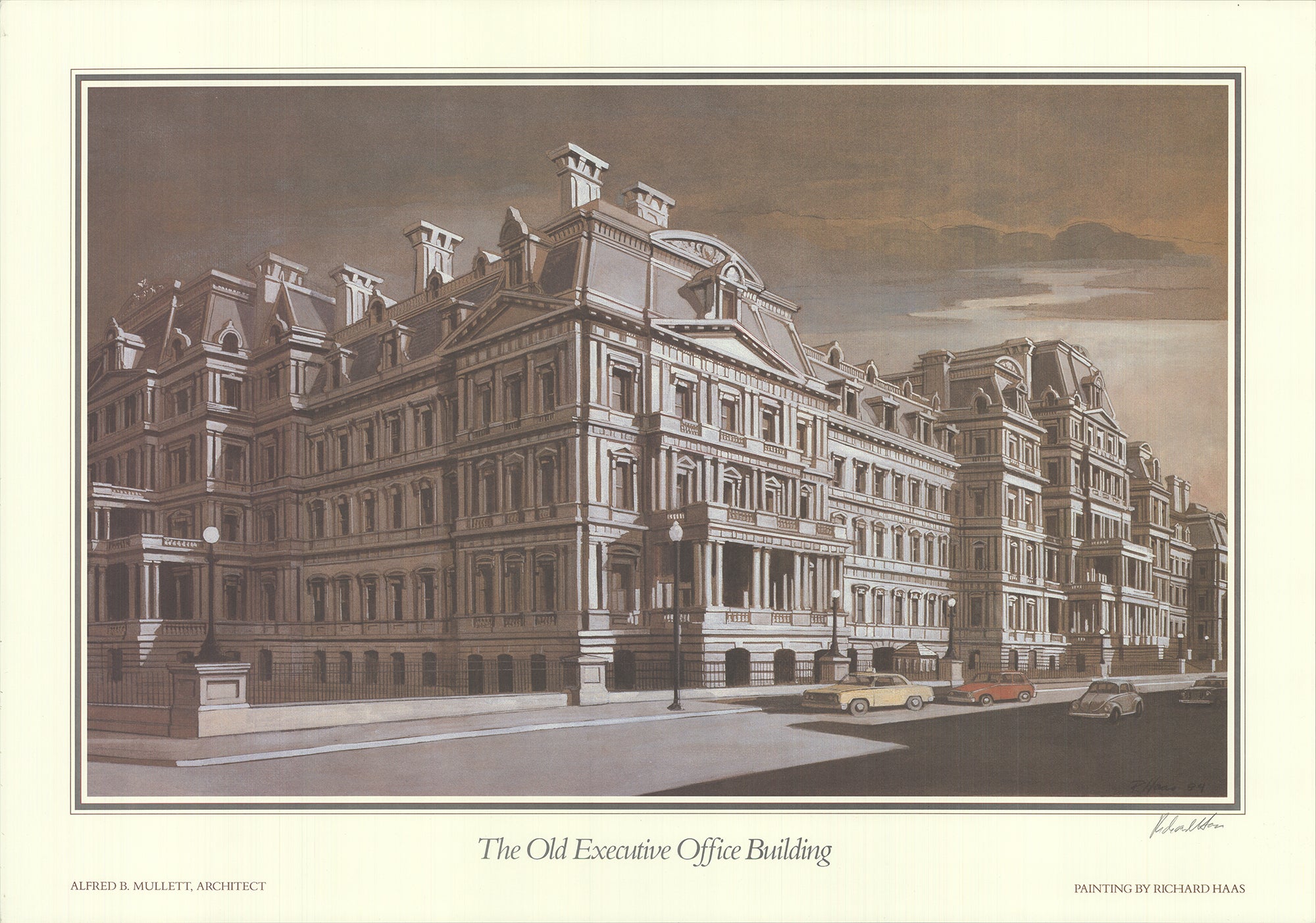 "The Old Executive Office Building" by Richard Haas, Signed Offset Lithograph printed in 1985. The overall size of the Offset Lithograph is 22 x 31.5 inches. The condition of this piece has been graded as A: Mint. Here is some supplemental information about the Offset Lithograph: Hand signed in pencil by Richard Haas.