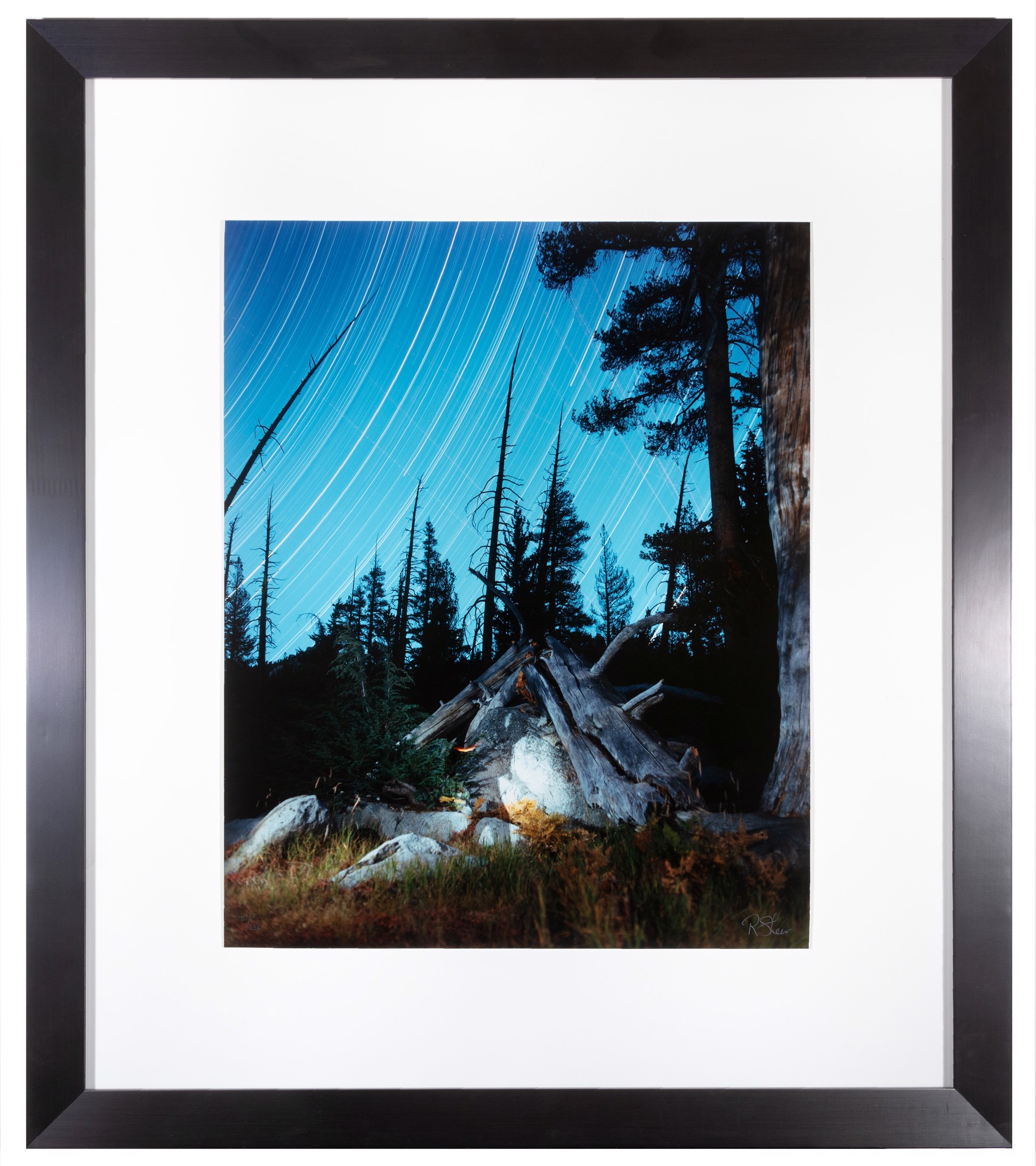 "The Spirit of John Muir with Star Trails, Yosemite" is a chromogenic photograph created by Robert Kawika Sheer. This landscape photograph is mediated by the body of the artist, which adds a performative aspect to the work. the picture depicts a clearing in a a pine forest. A kind of altar appears at the center of the photography, perhaps in homage to John Muir: a felled branch lays atop boulders, producing a tent-like silhouette. A spectral shadow is cast on the rocks. Star trails streak through the night sky. Using a 4 x 5 camera, Sheer achieves the effects of presence and of the passage of time captured in a single image by using a long single exposure lasting from forty-five minutes to seven hours. After the photographer opens the shutter of the camera, he enters the frame of the picture, becoming a performer in the scene. Because he is using low-intensity moonlight to illuminate the night, Sheer can enter the camera's view without the negative recording his movement. In this work, the artist can be seen casting his shadow on the rocks, underneath the wooden "tent." Through this ghostly image, which the artist calls a "Spirit Shadow," Sheer "performs" the spirit of John Muir in the natural setting of Yosemite, befitting the conservationist and the environmental activist who fought to make Yosemite a National Park. The star trails, formed by the long exposure of the film, track the passage of time and the movement of the Earth. "The Spirit of John Muir with Stars Trails" is a performative event, carefully stages for preservation in the future. Spirits in Corkscrew Canyon by Robert Kawika Sheer. (27/250)
