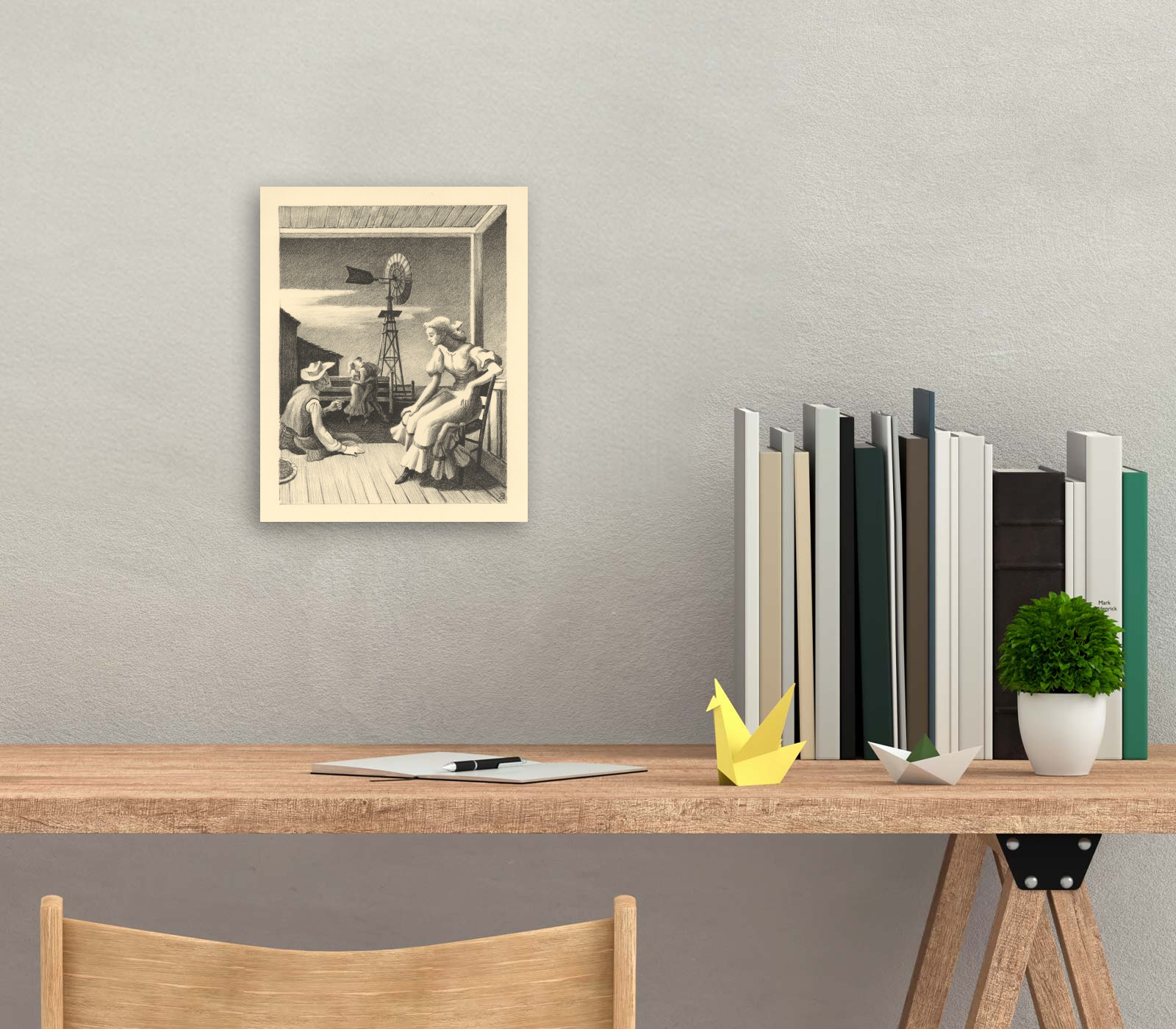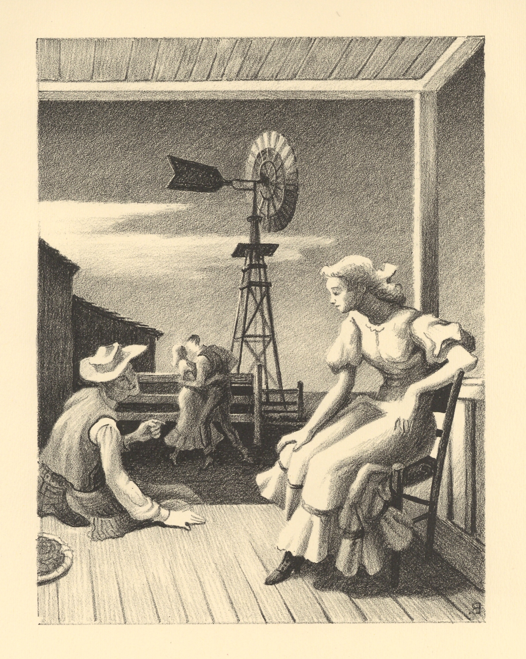 Medium: lithograph. Executed by Thomas Hart Benton to illustrate the Lynn Riggs classic "Green Grow the Lilacs" and printed in 1954 in a limited edition of 1500 by the University of Oklahoma Press for members of The Limited Editions Club. Image size: 8 1/2 x 6 1/2 inches (217 x 165 mm). Sheet size: 11 3/4 x 8 1/2 inches (295 x 218 mm). Signed in the plate (not hand-signed).