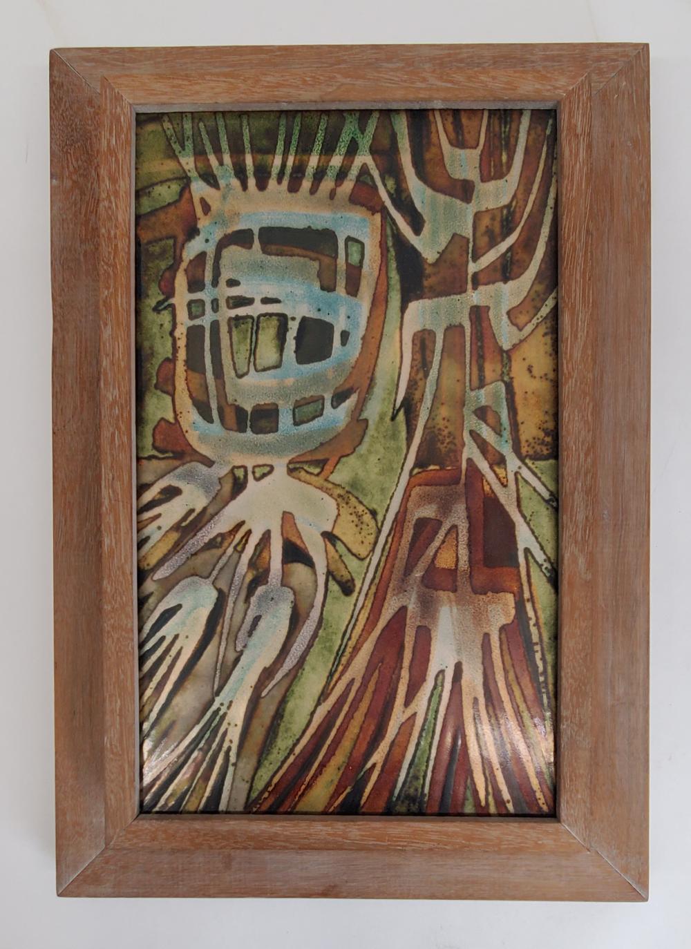 Mid century modern enamel painting on copper panel with transparent enamels overlaid in an abstract design to create shades of turquoise, brown, silver, gold, and green. This was the artist's favorite piece out of his many creations and it resided over his work desk for many years. Image measures 12" x 7"; housed in wooden frame measuring 15" x 10" x 2" constructed by the artist.