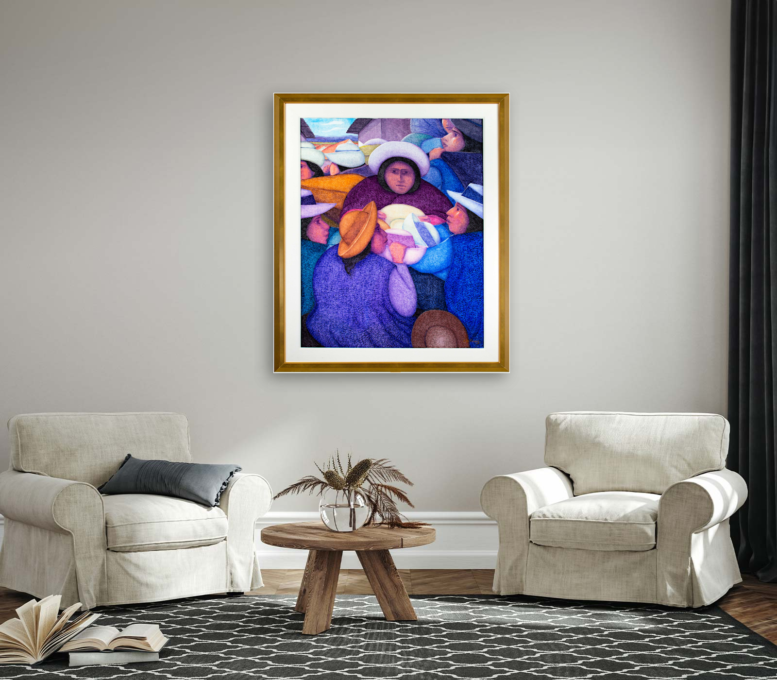 A leading Peruvian artist, Ernesto Gutierrez, was born in Lima, Peru, in 1941. His father was a Spaniard and his mother was a descendant of the Inca. Upon completion of his high school education, Gutierrez entered the School of Fine Arts in Lima, Peru, he received a Bachelor of Fine Arts Degree in 1964 and was awarded a Gold Medal. Sponsored by the Brazilian government, Gutierrez received the Itamarti Scholarship and studied for two years (1966-67) at the Museum of Modern Art in Rio de Janeiro while extensively exhibiting his works throughout the art centers of South America: Rio de Janeiro, Sao Paulo, Cordova, Santiago de Chile, and Lima, among others. In 1971, Gutierrez was granted a Fulbright Scholarship and studied at the University of Wisconsin where he received a Master of Fine Arts Degree in 1974. Gutierrez has been influenced by both local and global artistic factors: pre-Columbian forms and native-popular Peruvian art and also by modern French masters such as Cezanne, Gaugin, and to some extent, Matisse. The boldness of Gutierrez's colors creates an almost sensual excitement: shocking pink, chartreuse, mauve, and the whole gamut of blues, purples, and greens, often underlined and emphasized by complementary colors. In some of his paintings, Gutierrez assumes a cubist-realist simplification of forms and volumes and a precise rendering of surfaces. Gutierrez's sensibility strikes the viewer as essentially Spanish, while his inspiration derives from his Inca heritage, Peruvian landscapes, and folklore.