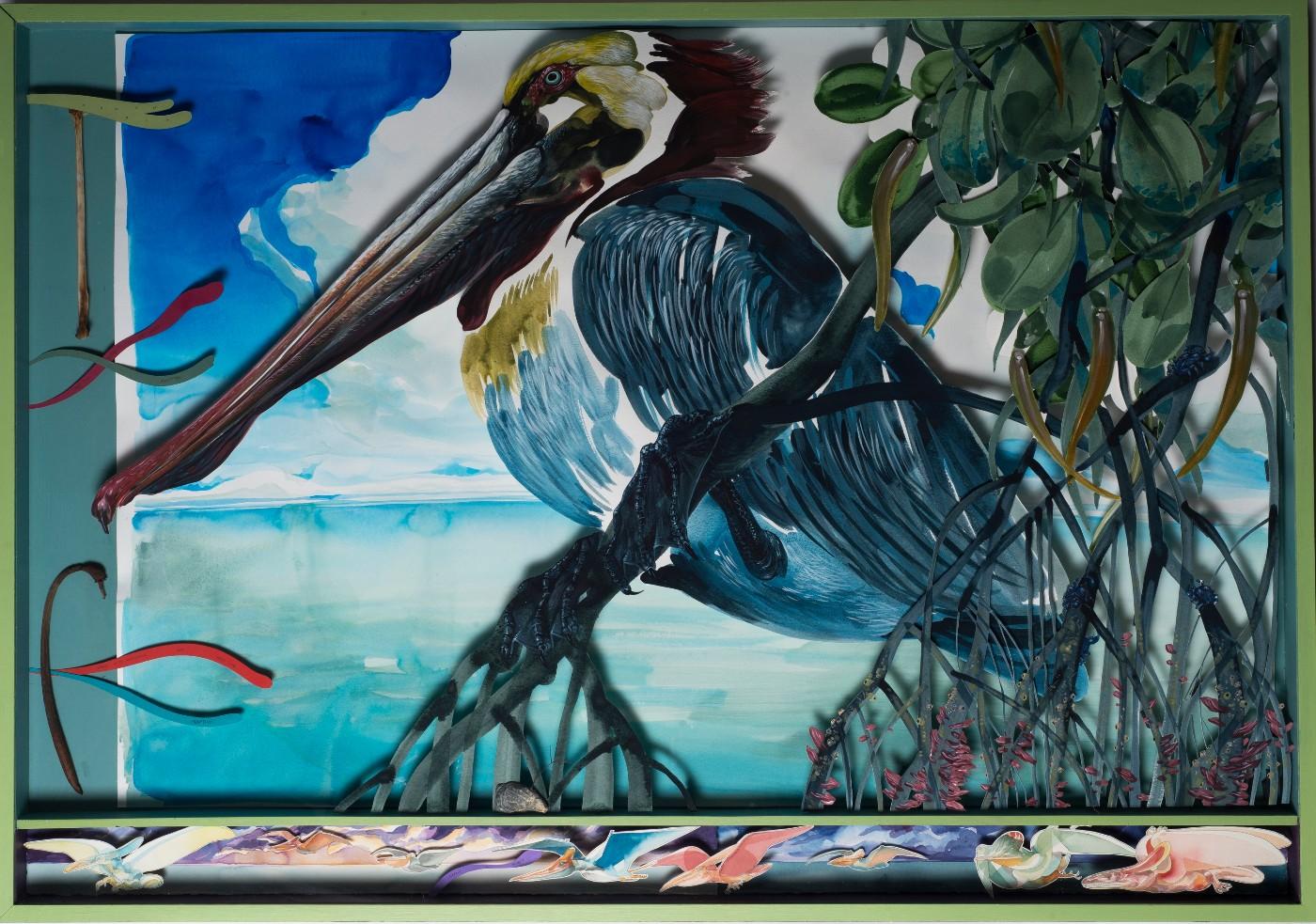 Hitnes, Pelican (The Dinosaur), 2017. Watercolor and graphite on paper in wooden frame.