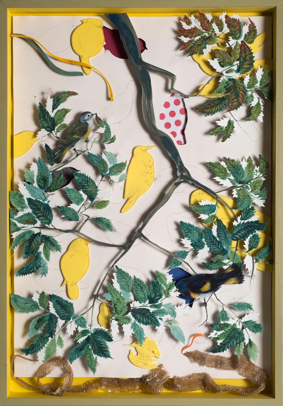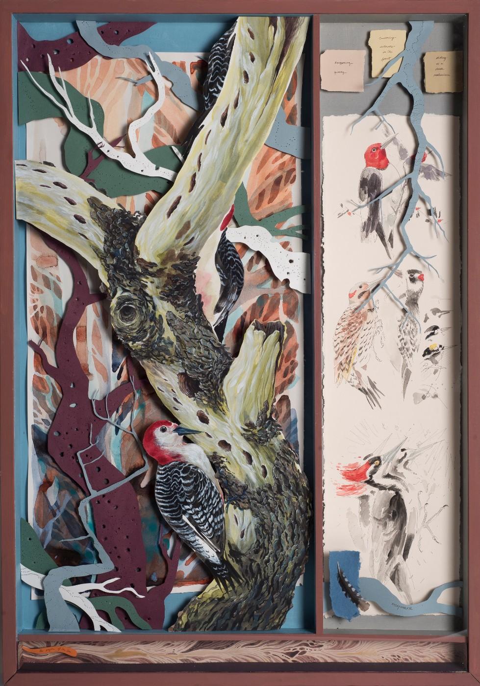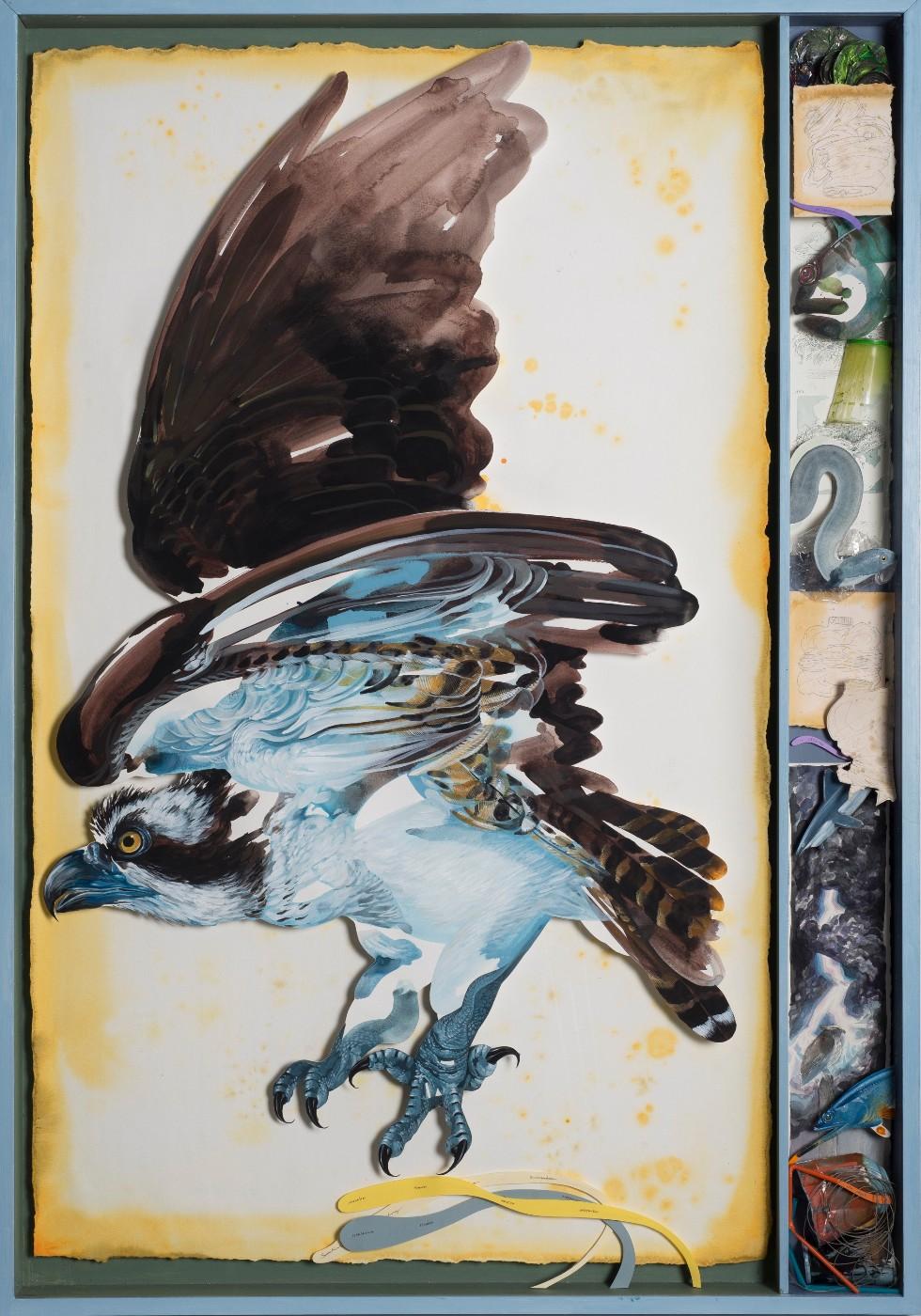 Inspired by Audubon’s original watercolors, Hitnes created The Image Hunter project. This entailed travelling through 15 states, from Florida to Ohio, creating sketches, paintings, and large-scale murals of the birds he saw. The exhibition includes objects and ephemera collected along Hitnes’s journey, and features 15 plexiglass shadowboxes with multi-segmented compartments, along with 53 small, copper-plate etchings Hitnes used to create his own miniature book, Fragments of The Birds of America. Hitnes’s multi-dimensional shadowboxes reference Audubon’s iconic work, while adding layers of information about the birds’ ecosystems, eating habits and history. A feature-length documentary film on Hitnes’s trip, directed by filmmaker Giacomo Agnetti, will also be on view.