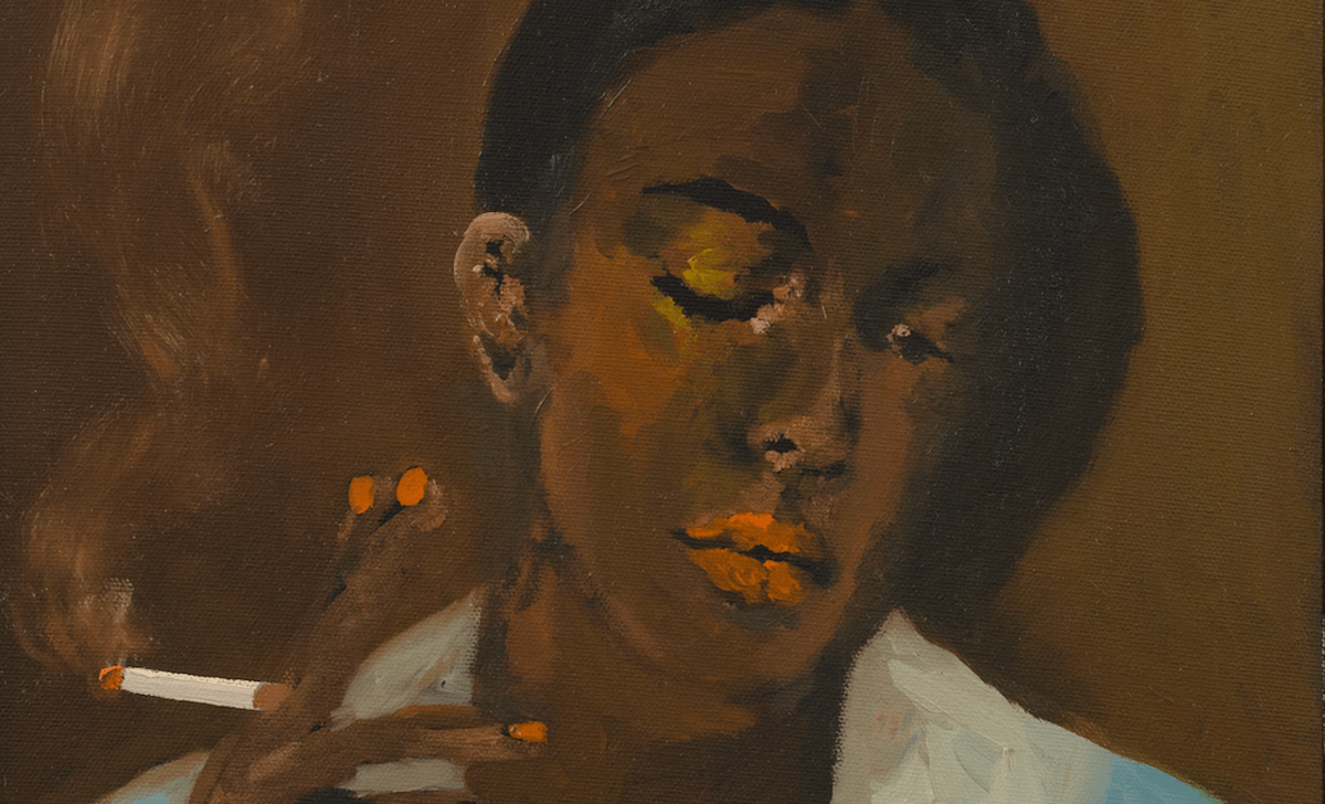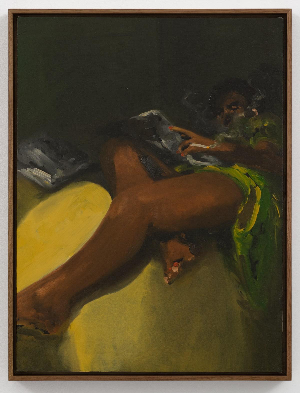 Mckinney reclaims and resituates the notion that in art history, Black women have been relegated to the fringes of paintings, often at work or in the background. Instead, she focused on the interior life of these often-forgotten figures: what they do when they get home after a long day – do they smoke a cigarette? Read a book? Paint their nails? Lie down on their sofa? McKinney’s paintings highlight the mundane, everyday life for Black women and focuses on their rest, while simultaneously creating distance between the viewers and the figures.