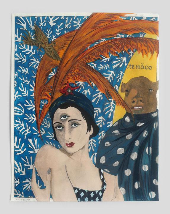 The 2020 Mexican series mashes up memories of a family sojourn south of the border with surreal costumed characters and exotic wild animals. The beguiling I am her minotaur and she is my matador portrays a theatrical femme fatale with a third-eye standing under a palm tree as a mythical minotaur waits in the wings, while Grandmother Nature's portrait depicts a stylish woman in front of a chorus line of dancing dames with beastly heads, with all of them amusingly wearing polka dot dresses. The delightful Moroccan drawings, which were produced in 2018 and will be published in a forthcoming monograph from the Louis Vuitton Travel Book series, also mix reality with fantasy in watercolors of tourists cavorting with monkeys and mannequins sporting patterned kaftans in a store window.