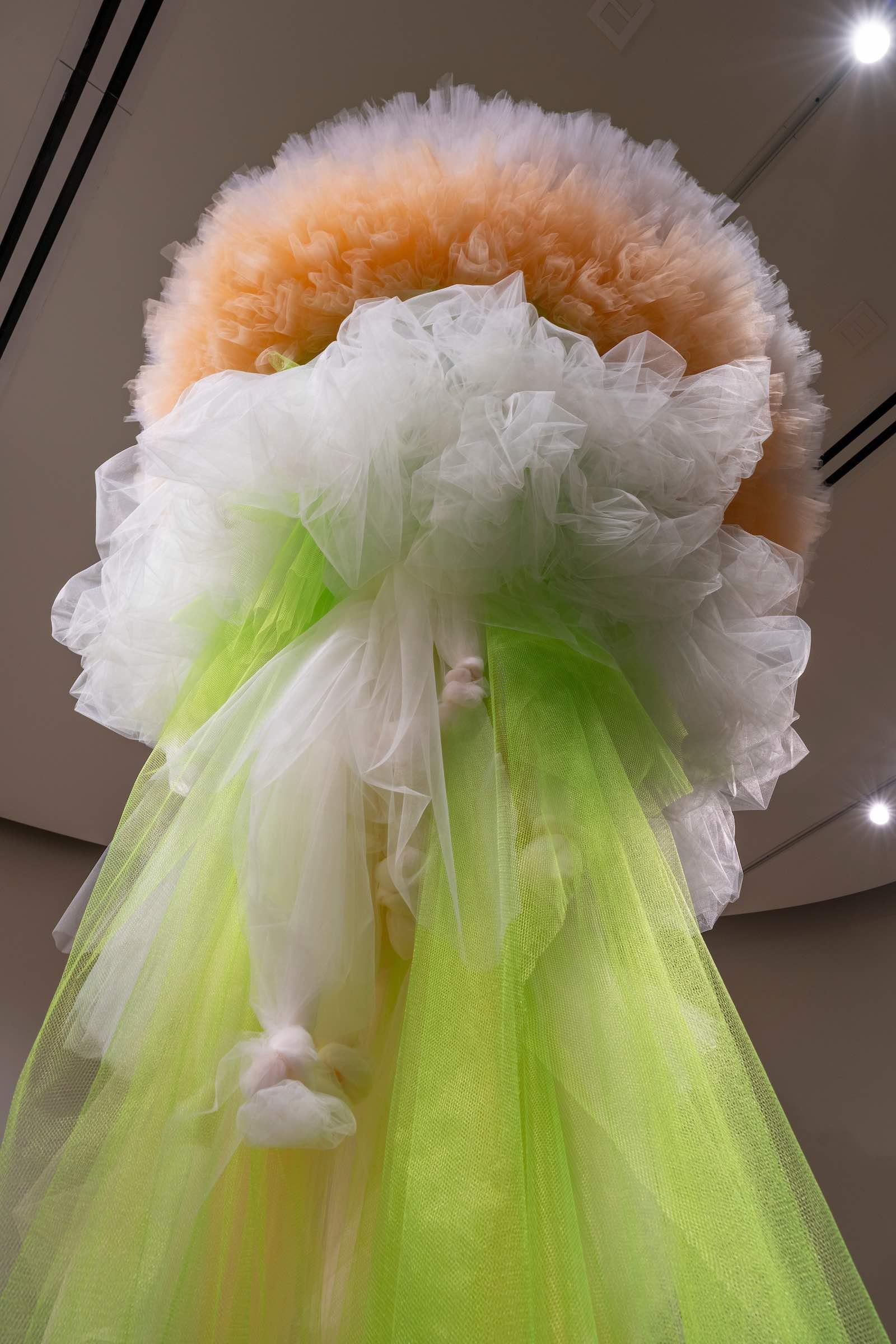 Hernando’s exhibit, titled Fervor: Illuminating the Spirit of Nature, displays monumental, site-specific installations of tulle—yards and yards of tulle, soft and translucent. A towering, flower-shaped sculpture trailing lime green strands of tulle—an allusion to stems—holds court in one gallery. In the adjoining gallery, a mountain of tulle—earthy brown and ochre with a snow-white peak—stands soft yet stalwart beneath a billowy tulle cloud.