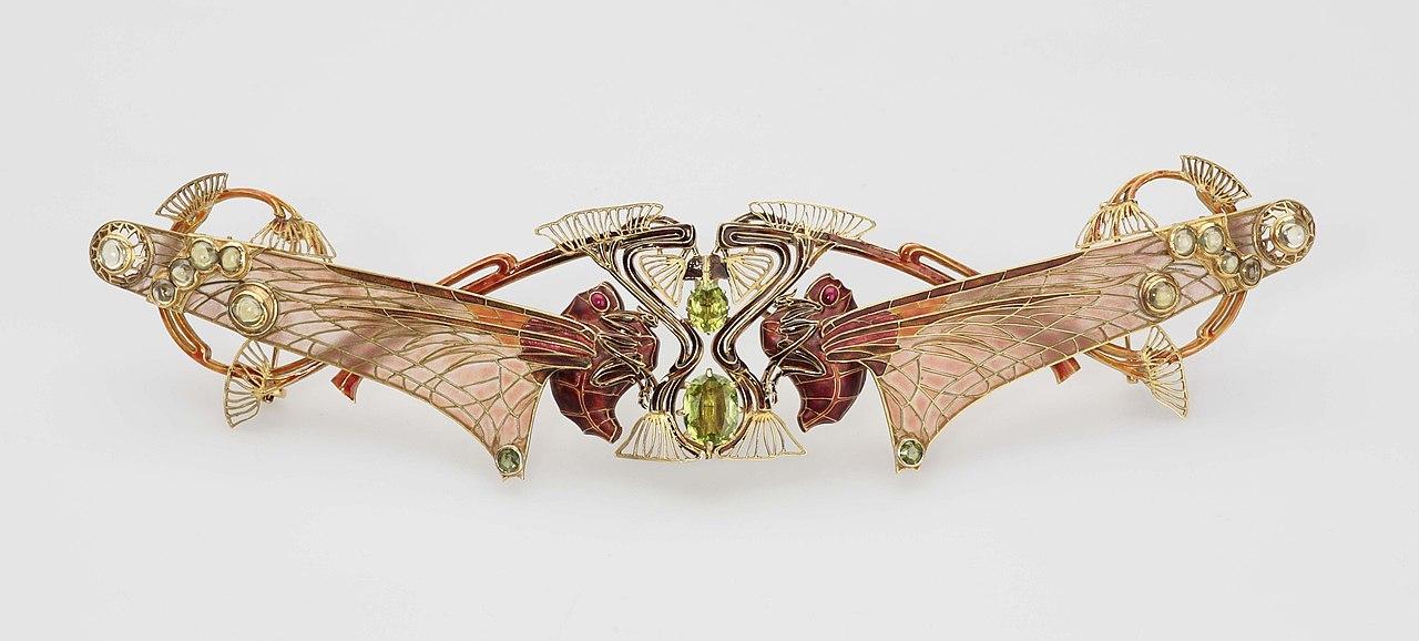 René Lalique, Corsage Ornament, 1903-05. Gold with en ronde bosse, plique à jour and champlevé enamel, cabochon rubies, facetted and cabochon peridots.
