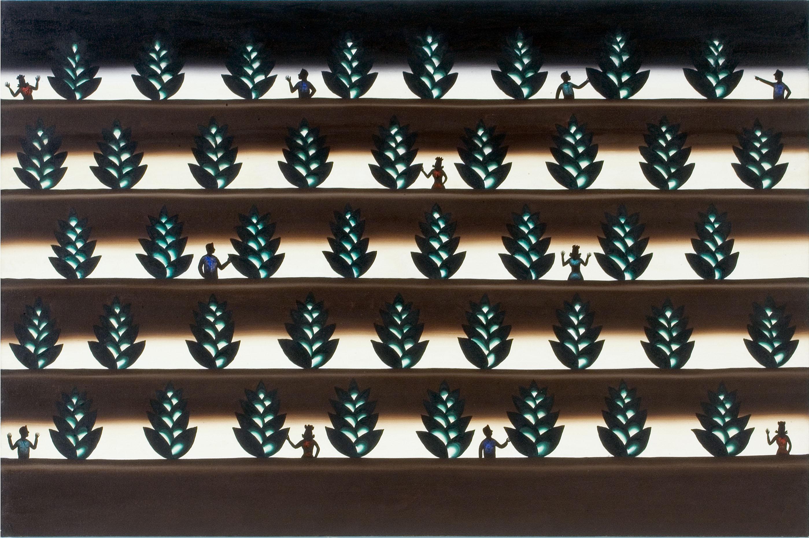 Roger Brown, Plants That Glo in The Dark Tra-La, 1986. Oil and phosphorescent paint on canvas. 48 x 72 inches. Museum purchase with funds provided by The Chaddick Foundation 2006, Collectors' Circle, Mary Powell, R.K. Benites & Dr. Micheal J. Teaford, and Delphia Allen Lamberson, 2007.08.20.
