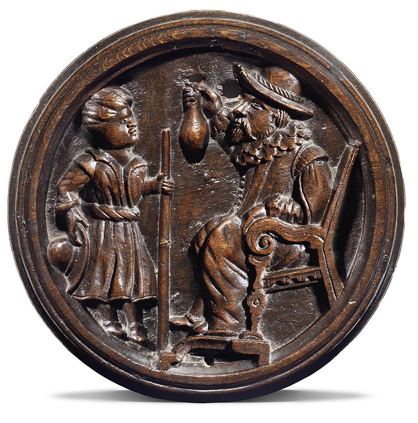 Carved with a scene depicting, on the left, an elaborately turbanned figure and, at right, a physician who holds aloft a flask, the wooden object seen above is, to put it quite bluntly, a 'piss-pot' lid or cover.