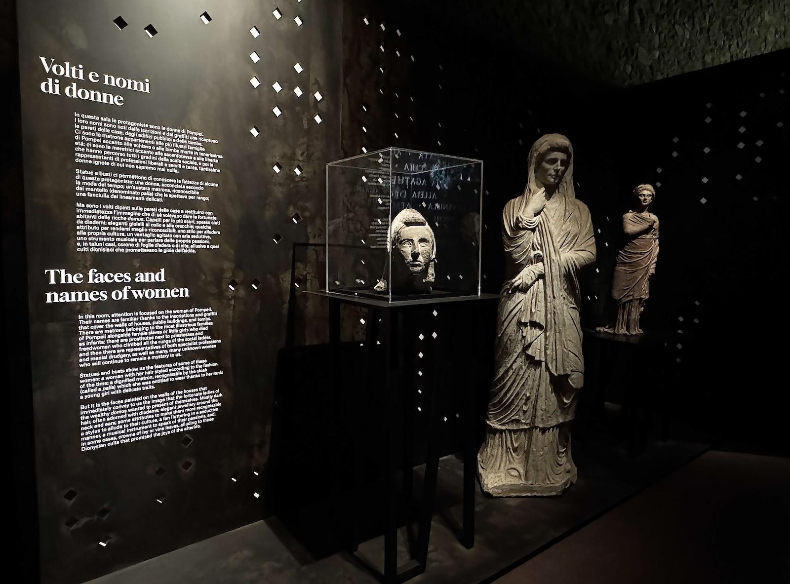 The first display within the exhibit offers an introduction to the names and faces of Pompeian women. On one side, a gently moving text projection of countless women's names recorded from inscriptions across the site over its long archaeological history dances across the wall. On the other, a brief primer on recognizing women through portraiture and other media provides useful context for viewing other images throughout the exhibit.