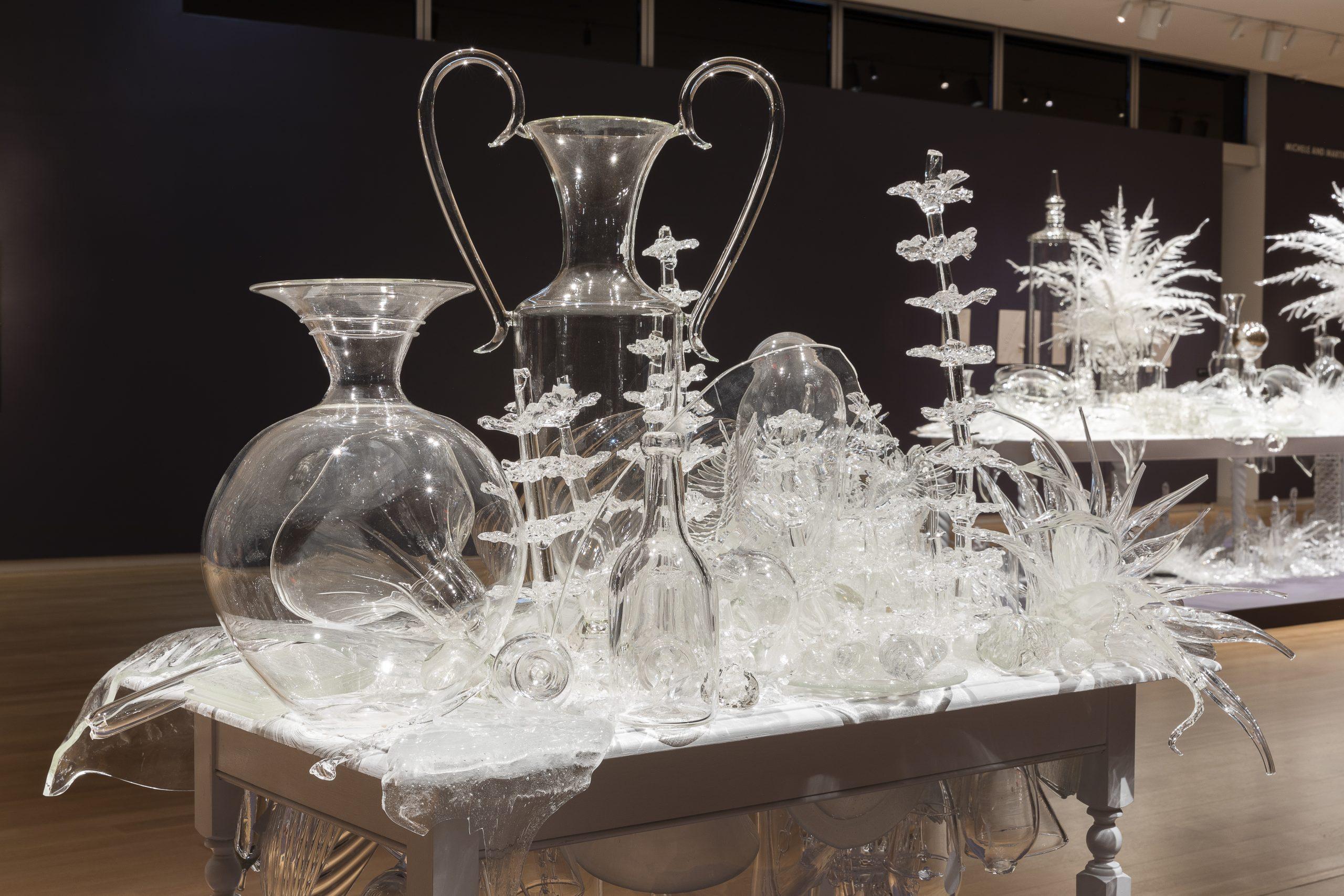 Lipman’s tabletop assemblages, like Laid (Time-) Table with Cycads and the smaller Sphenophyllum and Chains (2019), reference the vast tradition of still lifes in art history, and in particular the sumptuous vanitas and banquet scenes particular to the Dutch Golden Age. These scenes were laden with symbolism, each food and peculiar detail (like the presence of mice or monkeys) replete with a specific meaning. Reminders of the fleeting nature of our lives and the material wealth we may fill it with, when rendered in glass, the scenes take on a new dimension, their translucence giving them a ghostly, and certainly fragile, feel.