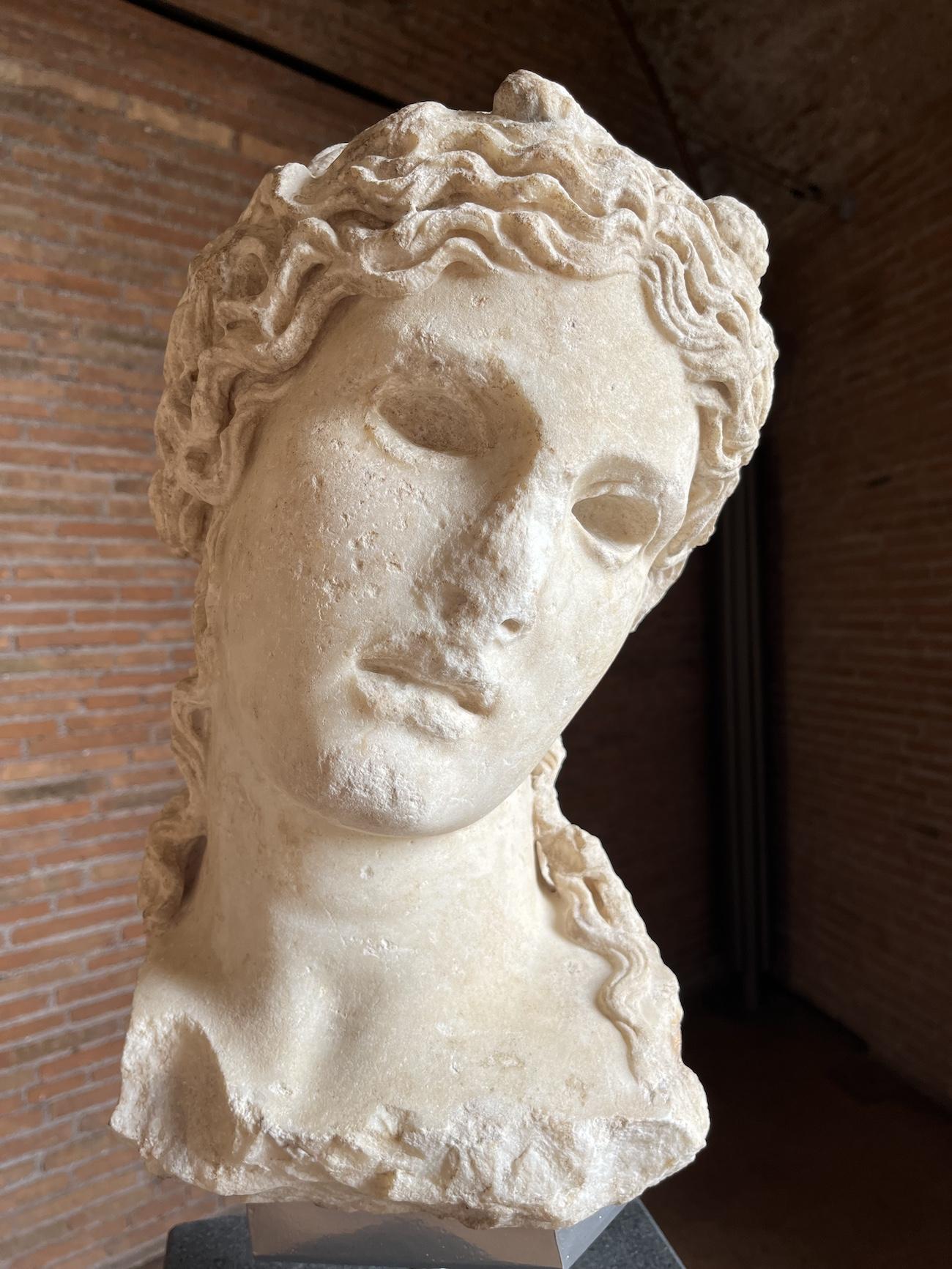 The Forums were abandoned by the early Middle Ages, their temples and colonnades collapsing in earthquakes or pulled down and recycled for construction. By the 10th century AD, the central piazzas were given over to agriculture, and a series of rudimentary structures were built atop where there had once been marble pavements. The recently discovered head, as well as those of Dionysus and Augustus, were all found in similar medieval walls, having been crudely reused as building material.