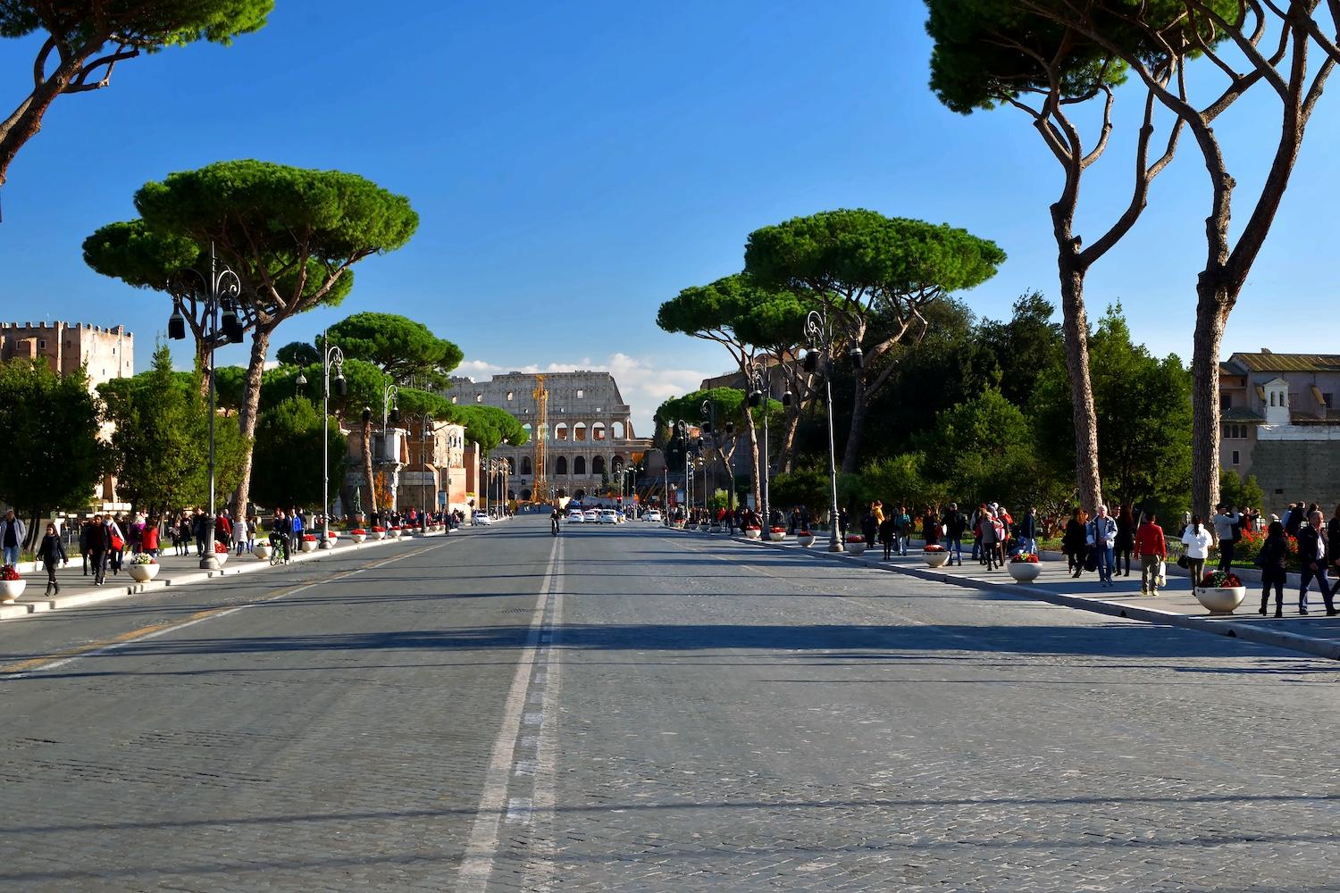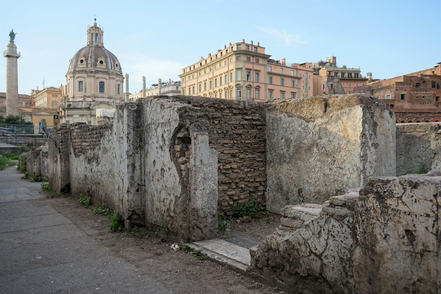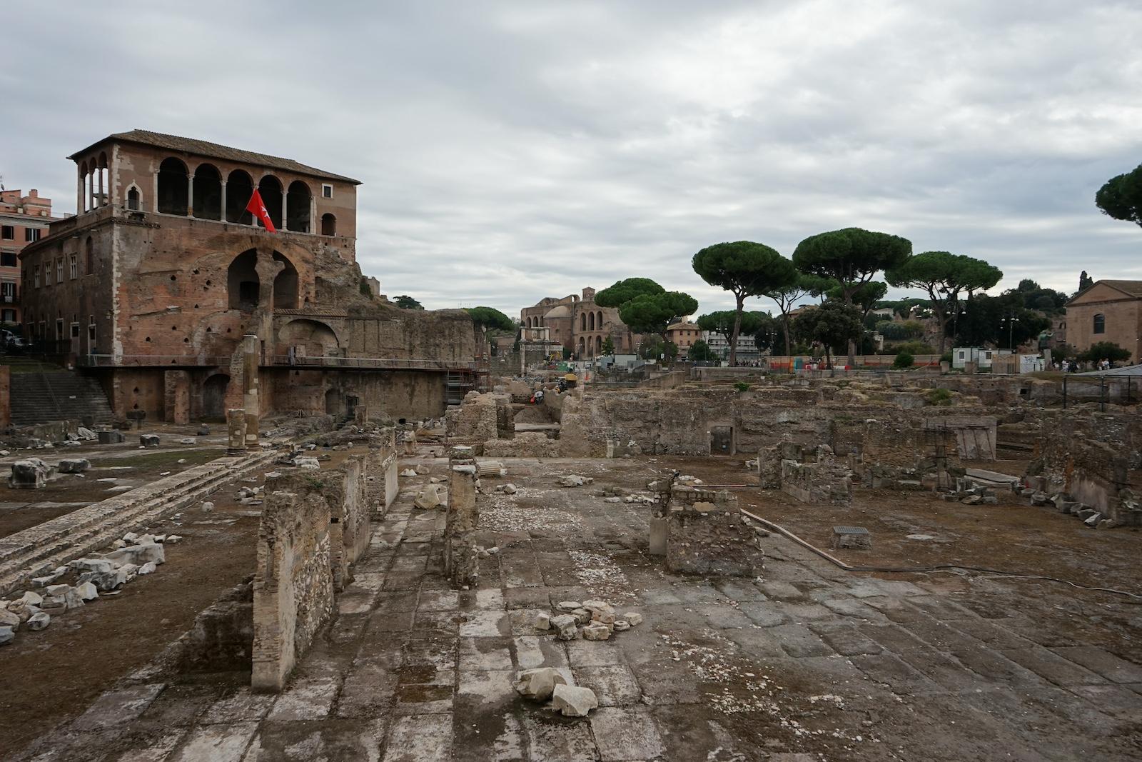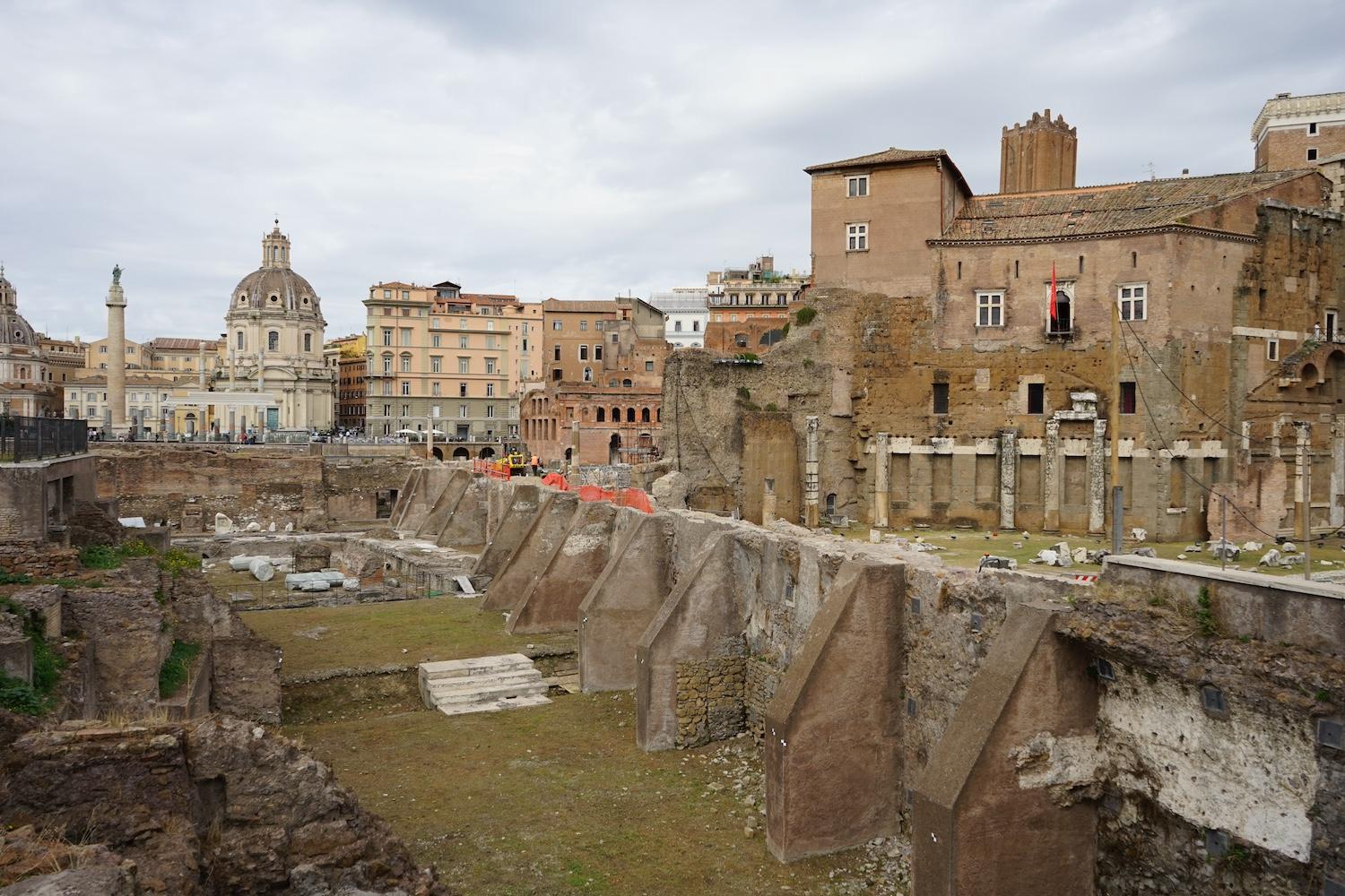 The area being explored is that of the Imperial Forums, a series of distinct but adjoining monumental spaces constructed over approximately two centuries, from 55 BC to AD 112, by Julius Caesar and the emperors Augustus, Vespasian, Domitian, and Trajan. Although each Forum differed in design, they all effectively comprised a large, rectangular, open court, surrounded by colonnades, and dominated by a temple at one end. Used to host ceremonies and to hear legal cases, the Forums also served as showpieces for the regimes and were richly ornamented with statues and colored marbles brought from across the Empire.