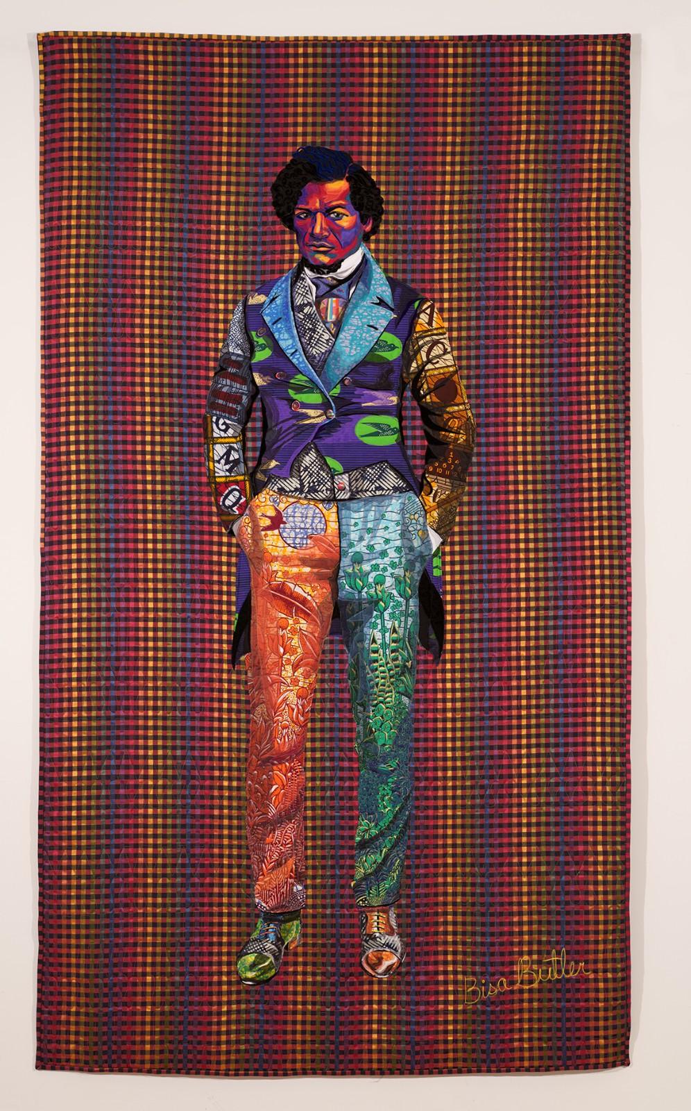 The title of Butler’s show was taken from a 4th of July speech in 1852 given by the famous African-American political leader Fredrick Douglass (1817-1895). Her portrait of Douglass is the only one in the show that is a faithful rendering of the person. Her other portraits, while inspired by historical black and white photographs, are amalgams of individuals, composite characters whose personalities explode through opulent fabrics and mind-blowing color.