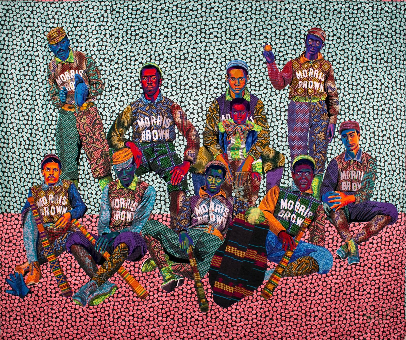 Bisa Butler, The Safety Patrol, 2018. Quilted and appliquéd cotton, wool, and chiffon. 90 x 82 in.