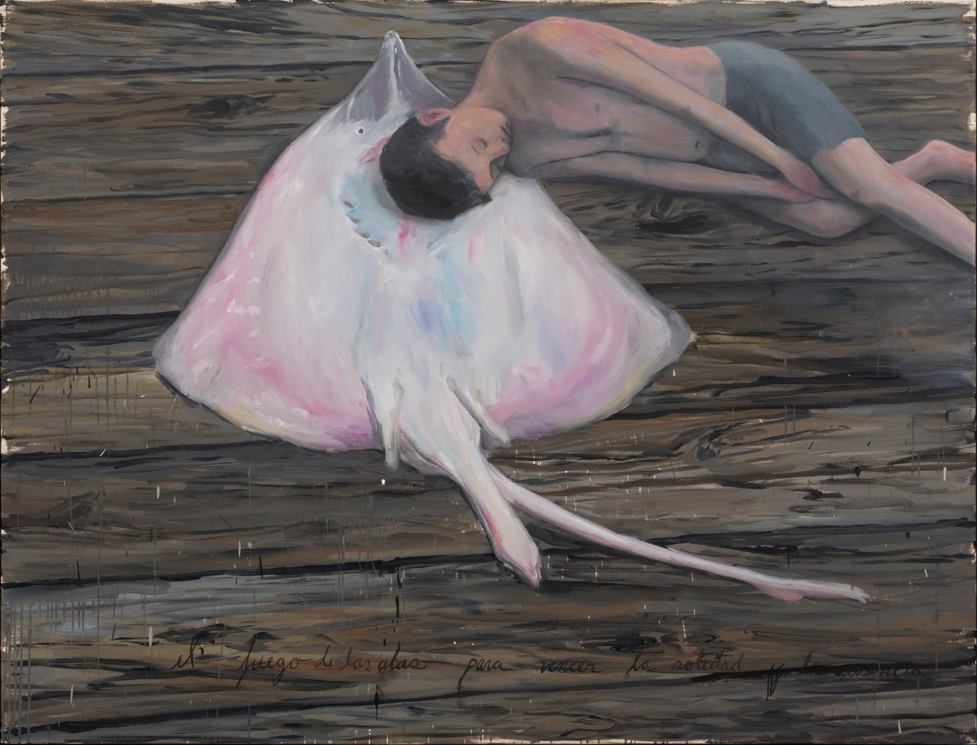 Martínez Celaya’s boys are on the cusp of adolescence, straddling childhood and adulthood. Caught in the midst of a boyhood adventure, they hold the branch of a tree and hang, mid-climb; rest on a dock, head pillowed by a stingray; and pensively hold aloft a bird, dipped in gold paint. “As I understand him, the boy is weary and excited, and he knows both less and more than he thinks he does,” says Martínez Celaya. “The boy’s body and his heart are summoned by the future, though his mind, his algebra of categories and understandings so shaped by the past, is likely to lag behind.”