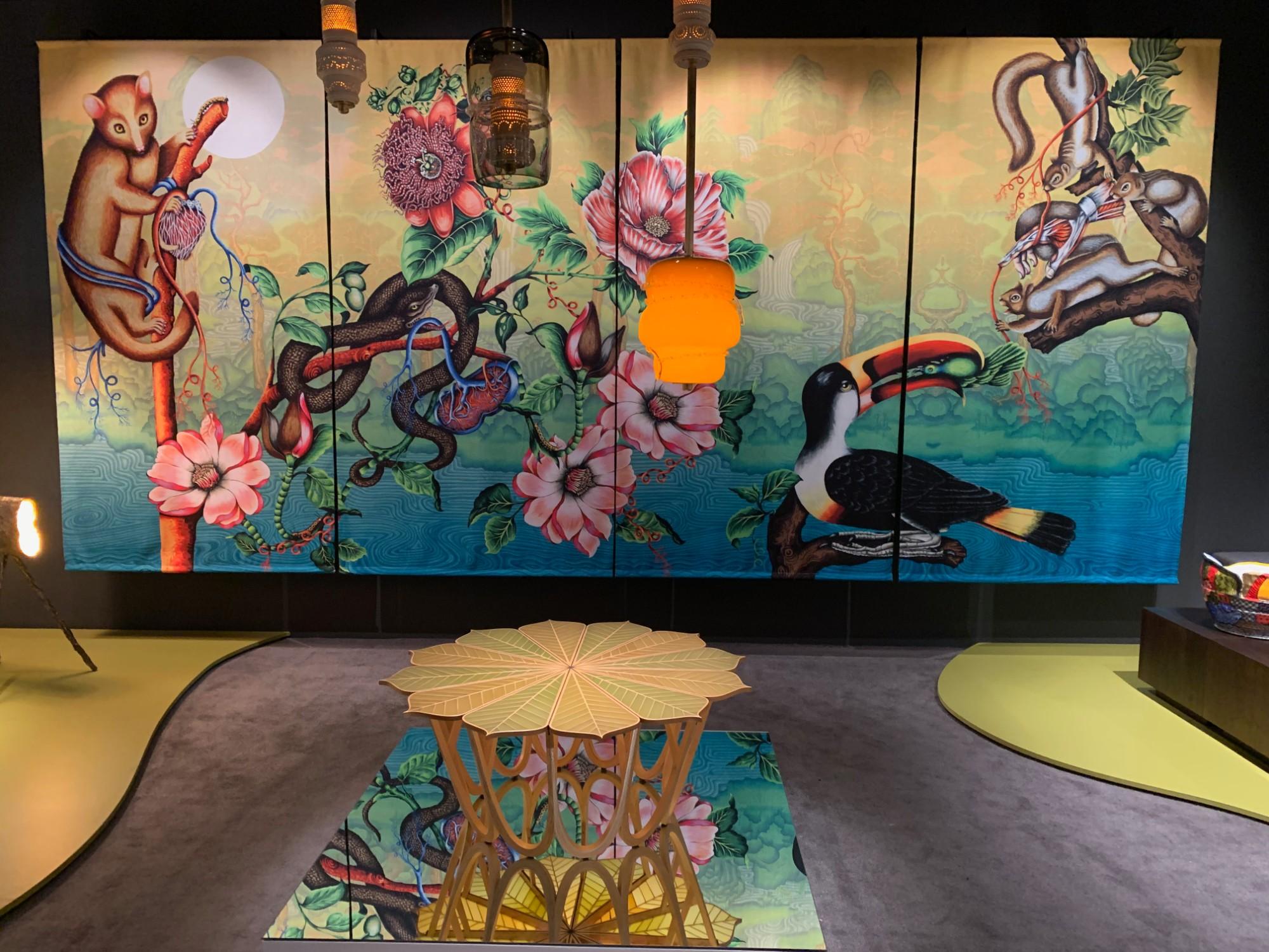 Many exhibitors were prone to flights of fancy and imagination. New York-based R & Company featured chandeliers and mirrors that loosely resembled corals, and their illumination was reminiscent of bioluminescence. Similarly, Paris-based Maison Rapin had a set of mirrors by Goossens Paris, whose frames were adorned by gilded crowns of leaves, wheat, and corals, a choice that, instead of looking faux-antique or kitsch, gave the mirrors an ethereal appearance.