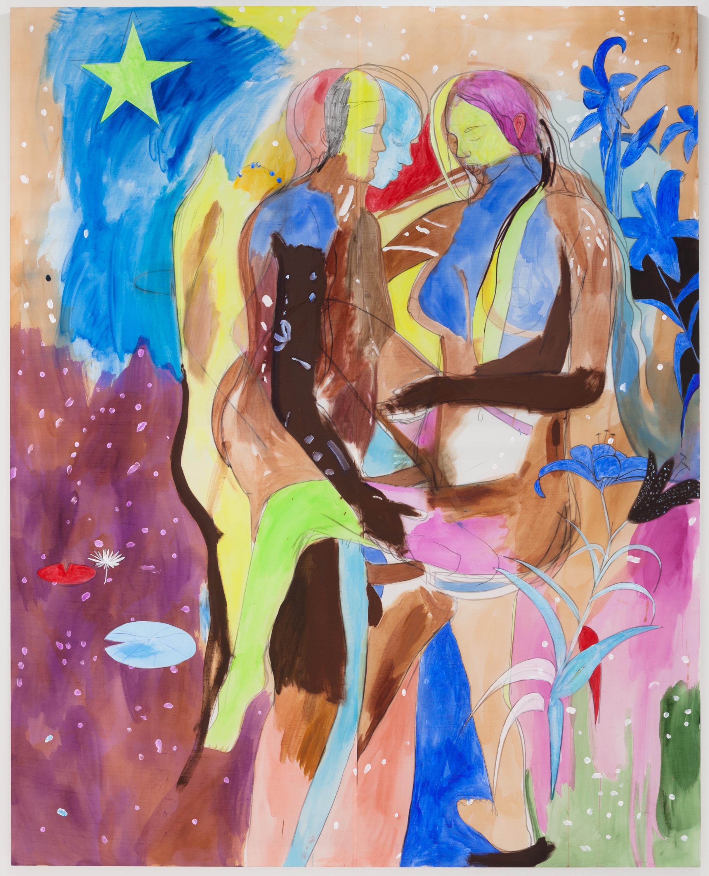 Chicago artist Paul Heyer creates a magical confluence of sci-fi imagery, surreal figures, fairy tale forests, abstract forms, skyscapes and hypnotic music in his first solo show at the Museum of Contemporary Art Chicago. An immersive installation, rooted in Heyer’s experiences and memories of rave and club culture, the exhibition features a soundtrack that helps draw listeners into another world. Heyer’s large, pastel paintings, along with recent sculptural works, including brooms that hang in a constellation above the viewer, interact with the music to create a multisensory, dream-like realm. A common theme is transformation, with, according to the artist, “brooms becoming universes, people becoming skies, apples becoming blue.” Heyer wants to bring the viewer into a space where the imagination and magic of childhood are vibrantly alive, and anything is possible. Heyer says, “it’s my job to play and invite the viewer in to play.”