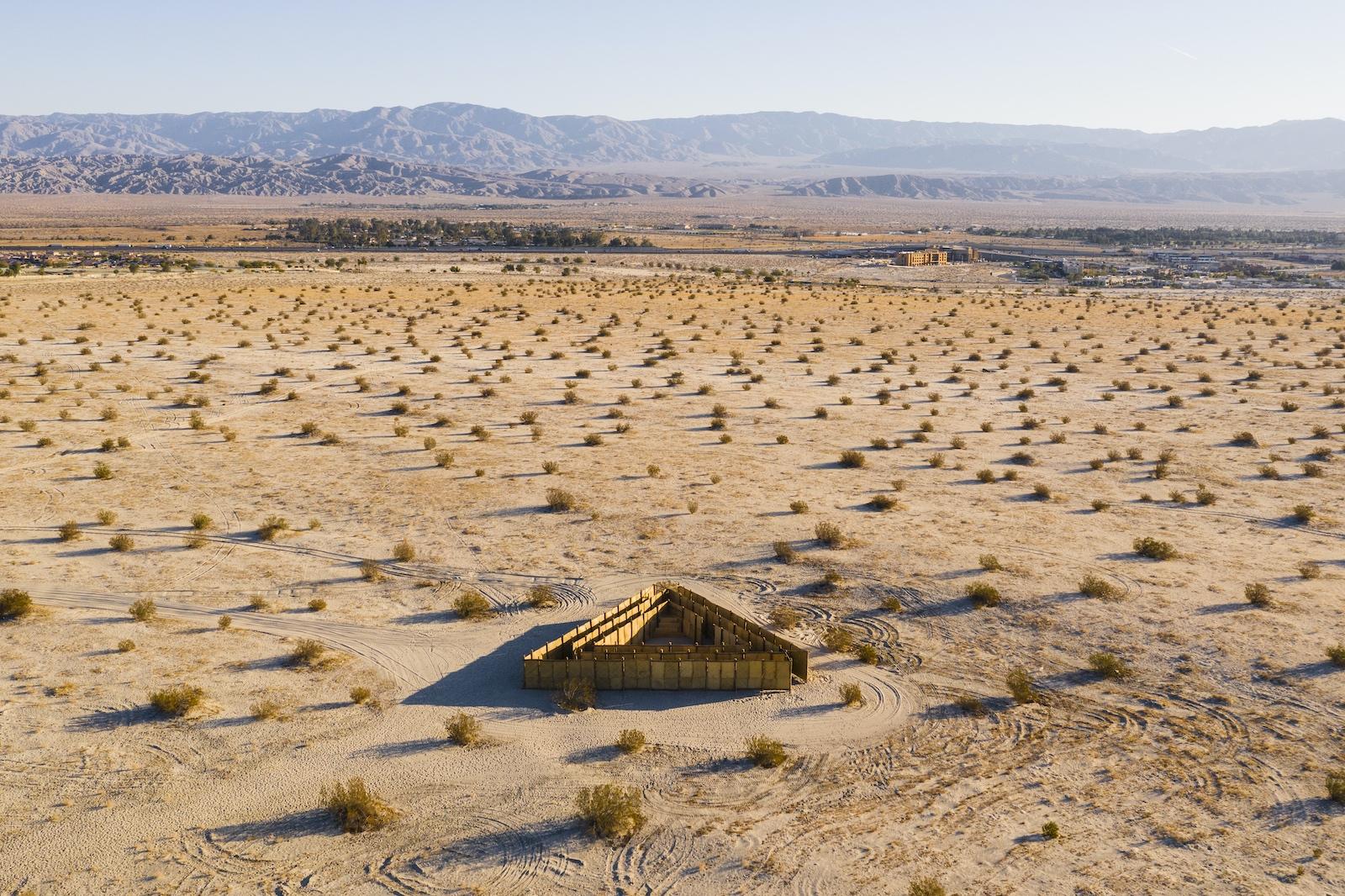 Erasure of a different kind is the focus of Felipe Baeza’s mural Finding Home in My Own Flesh, which examines the invisibility of queer communities of color in the Coachella Valley. ParaPivot (sempiternal clouds) by Alicja Kwade is a large-scale sculptural work with white rocks seated on a metal frame. Another large-scale piece, The Passenger by Eduardo Sarabia is a triangular maze structure made from woven palm tree fiber. Stratas of time are emulated in Zahrah Alghamdi’s What Lies Behind the Walls, a monumental sculptural wall that echoes abandoned buildings in the North Saudi desert.