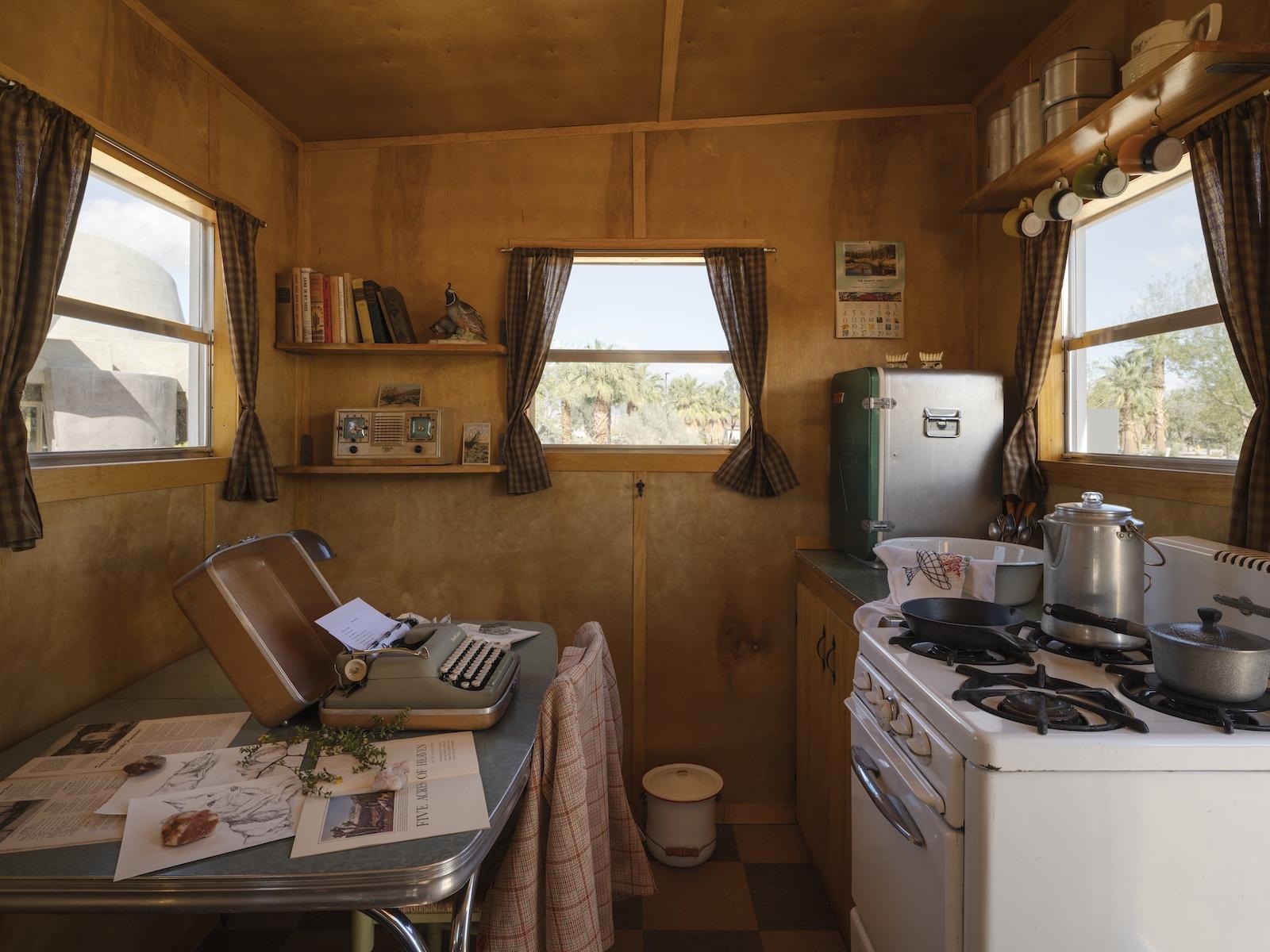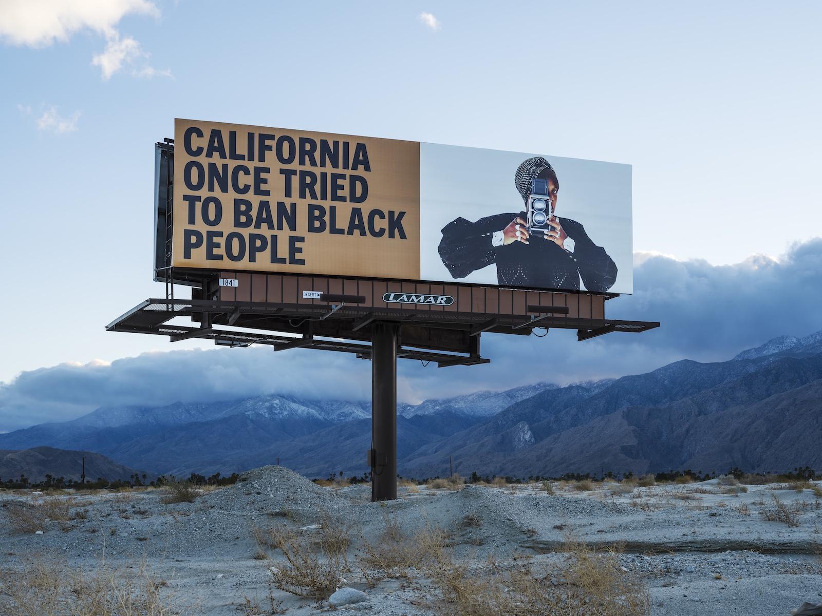 Jackrabbit Homestead is Kim Stringfellow’s diorama symbolizing homesteaders who arrived in 1938, on the heels of Southern California’s Small Tract Act. It stands in contrast to Nicholas Galanin’s Never Forget, which comments on land appropriation from indigenous peoples in Southern California. Never Forget rises fifty feet and is three hundred thirty feet long, a scale replica of the famous Hollywood sign lengthened to its original “Hollywoodland,” promoting a 1923 housing development that excluded people of color.