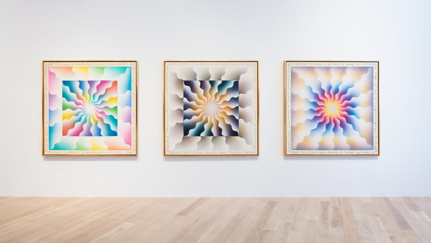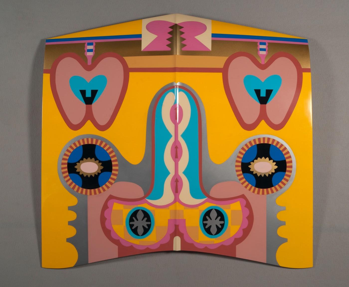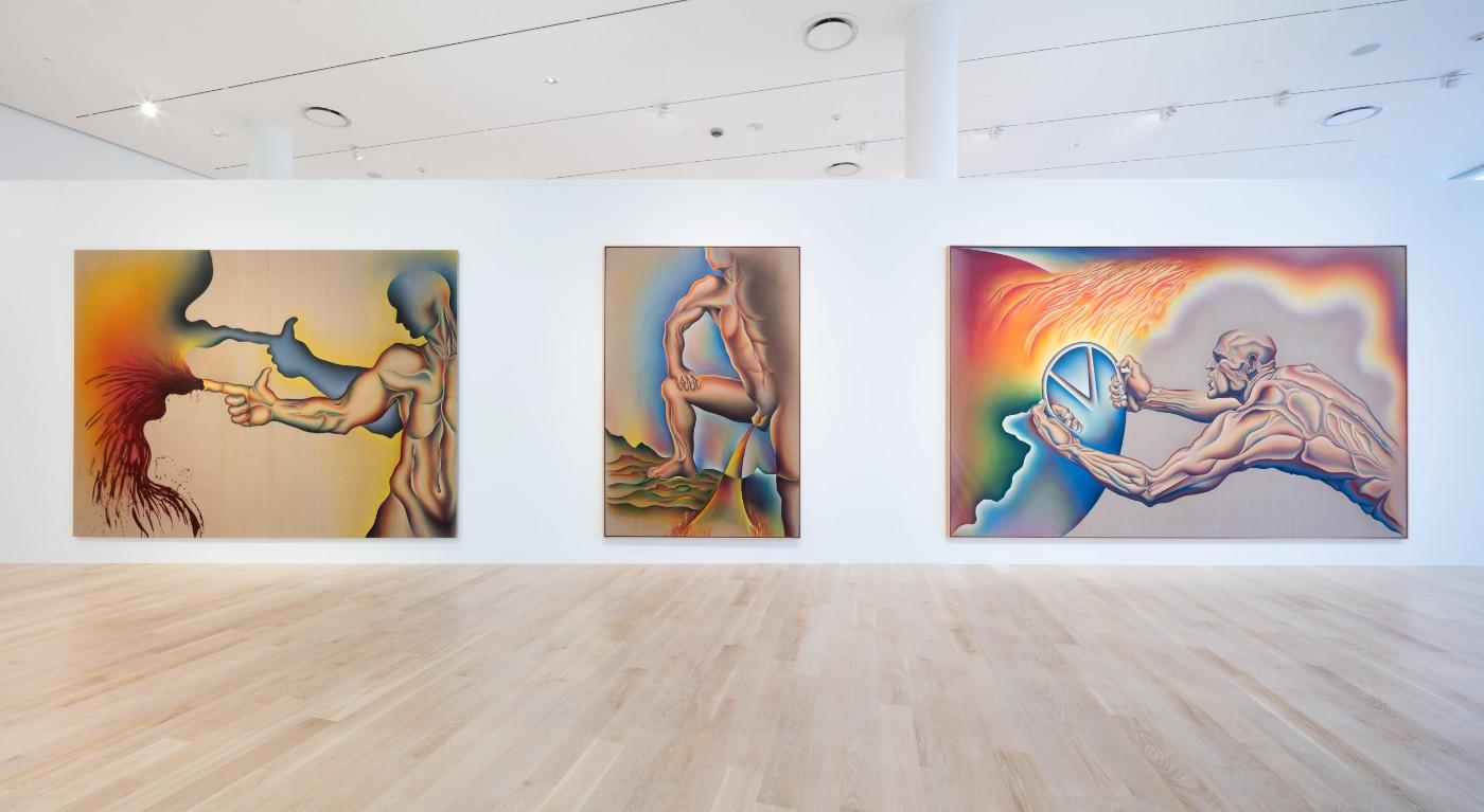 Judy Chicago: A Reckoning includes works from the 1960s to the 1990s, showing Chicago’s growth and experimentation, with ever-present thread of examining gender politics. Though she is best known for her massive multi-media The Dinner Party (1974–79) installation, which features dinner places set for history’s most important women, with individual ceramic plates and textile placemats, Chicago’s body of work includes a wide range of media. Her Car Hoods (1964-2011) series and bright abstractions may surprise visitors who expect work reminiscent of The Dinner Party.