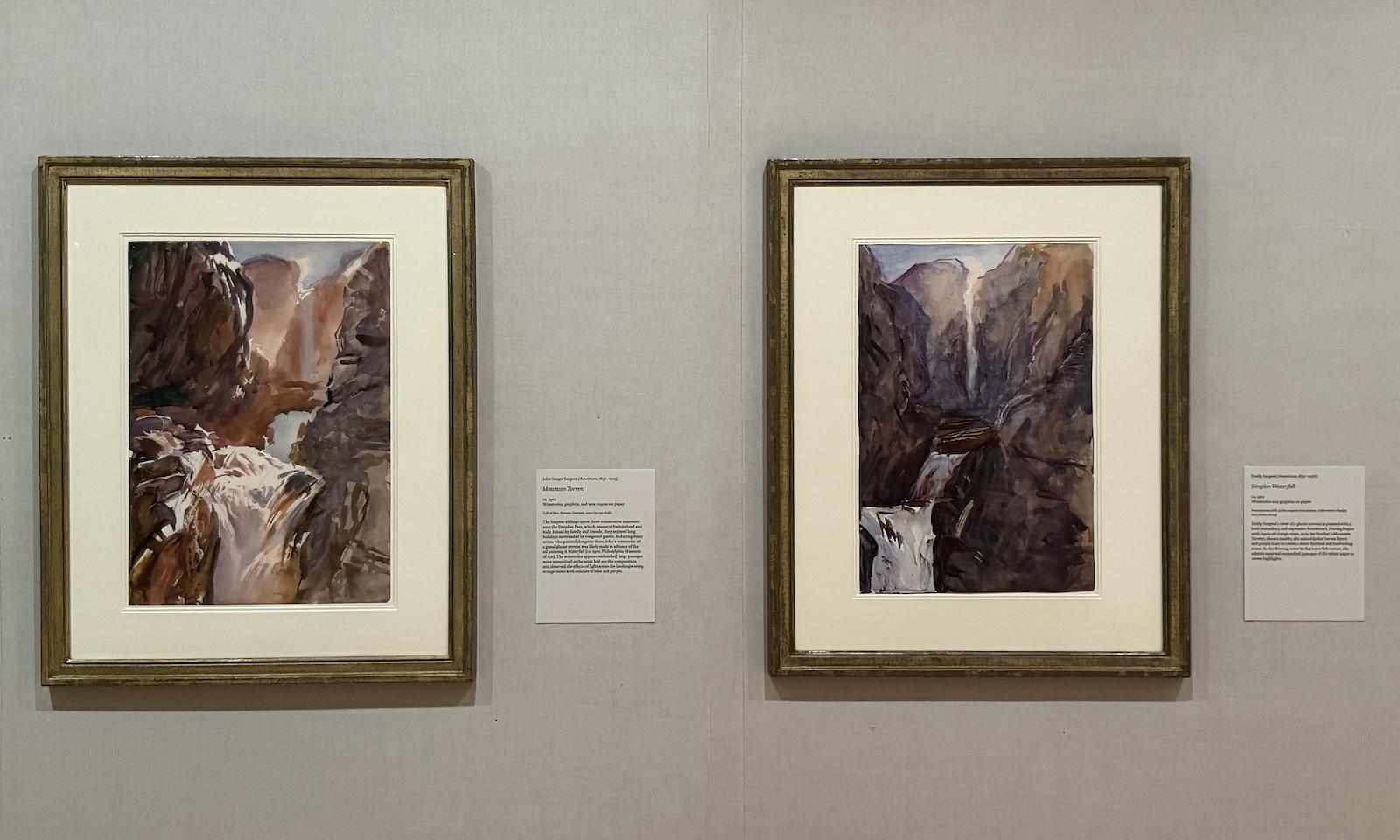 Left: Mountain Torrent (ca. 1910), John Singer Sargent. Watercolor, graphite, and wax crayon on white wove paper. Right: Simplon Waterfall (ca. 1910), Emily Sargent. Watercolor and graphite on paper. The two images side by side showcase the differences in the siblings styles and techniques.