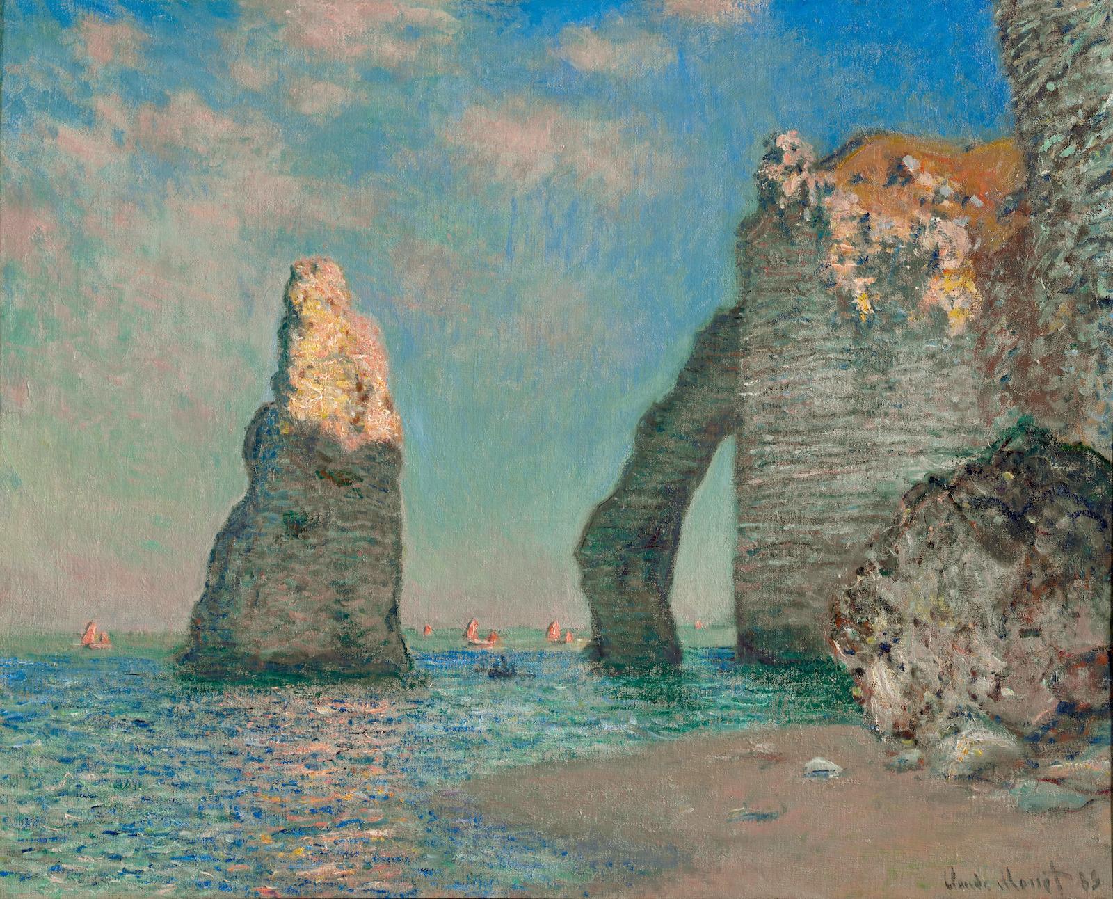 The village was sixteen miles northeast of Monet’s hometown of Le Havre, and he had many happy memories of the Normandy coast with his wife and two sons before the tragic death of his wife Camille in 1879 at the age of thirty-two. As he headed to Étretat in the off-season of 1883 in search of novel scenes, he was in a difficult place. He was under pressure from his dealer to produce marketable paintings, and the physical demands of painting outdoors in changeable weather were exhausting. He was also struggling over his unresolved relationship with Alice Hoschedé, the wife of his patron and surrogate mother to his children.