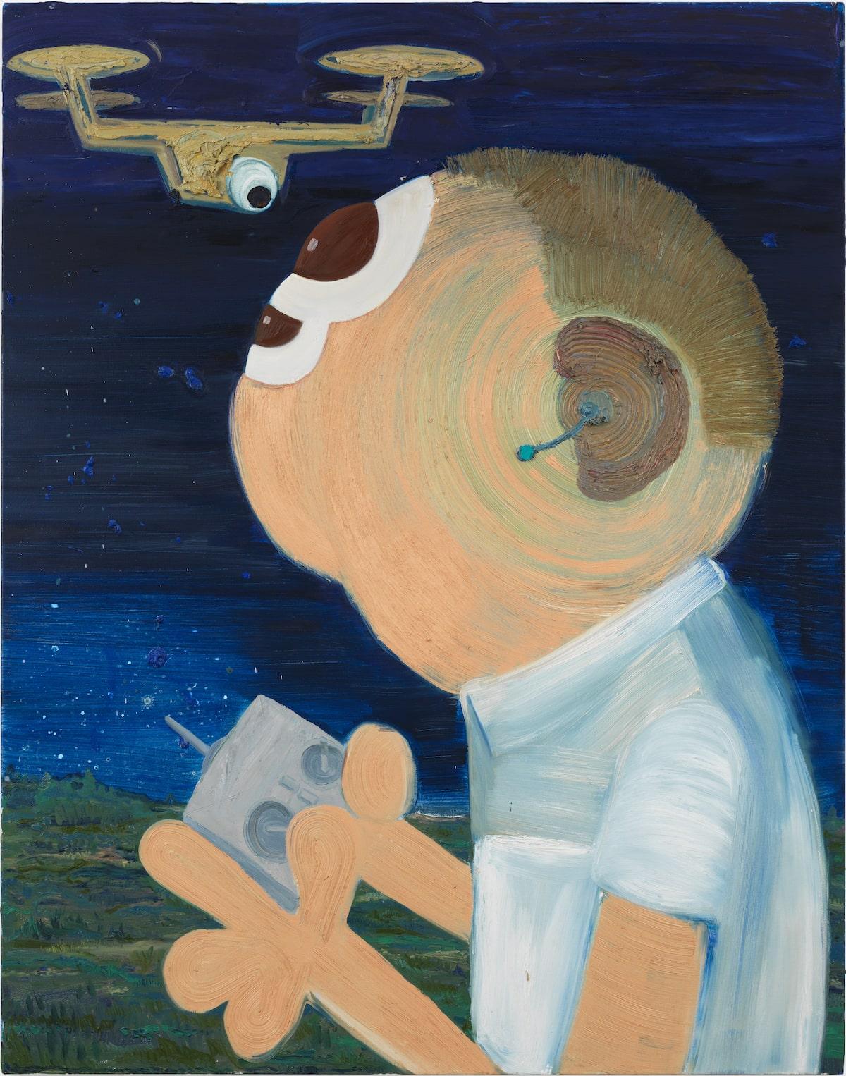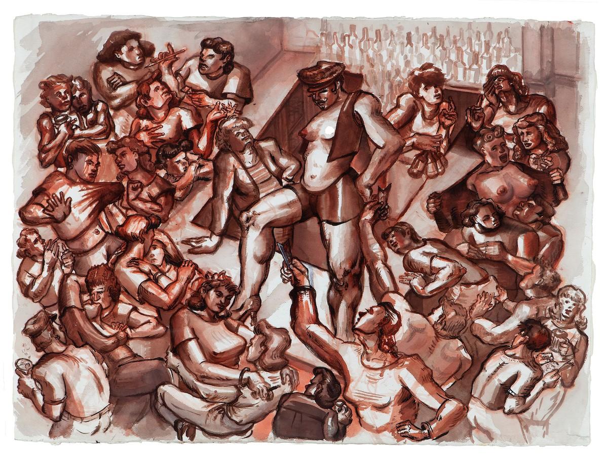 The MCA exhibition has a special selection on view including paintings on canvas, mixed media on paper, and sculpture. In some of her work dating from the early 1990s, the artist’s interests and inspirations seem more evident as the paintings in question include a multitude of figures not unlike the paintings made by the Mannerists, but here the artist uses various shades of a singular color in elaborate scenes. With titles such as Trash’s Dance (1992), Artforum (1993), and Lemonade Stand (1994), these three examples feature monochromatic tones ranging from shades of pink, grey, and blue and a landscape of bodies.