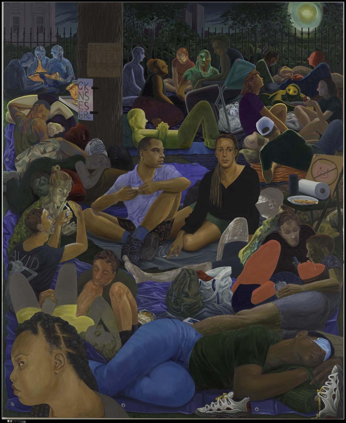 This modality of working with many figures in a what feels like a small space is also relevant once again in The Abolitionists in the Park (2020-2021) which the artist made during the pandemic in reference to friends and family who protested after George Floyd’s murder in support of Black Lives Matter. The work is on loan from the Metropolitan Museum of Art and features a selection of people sitting in a park, clustered together with only a small section of ‘ground’ (in this case a blue picnic blanket) visible.