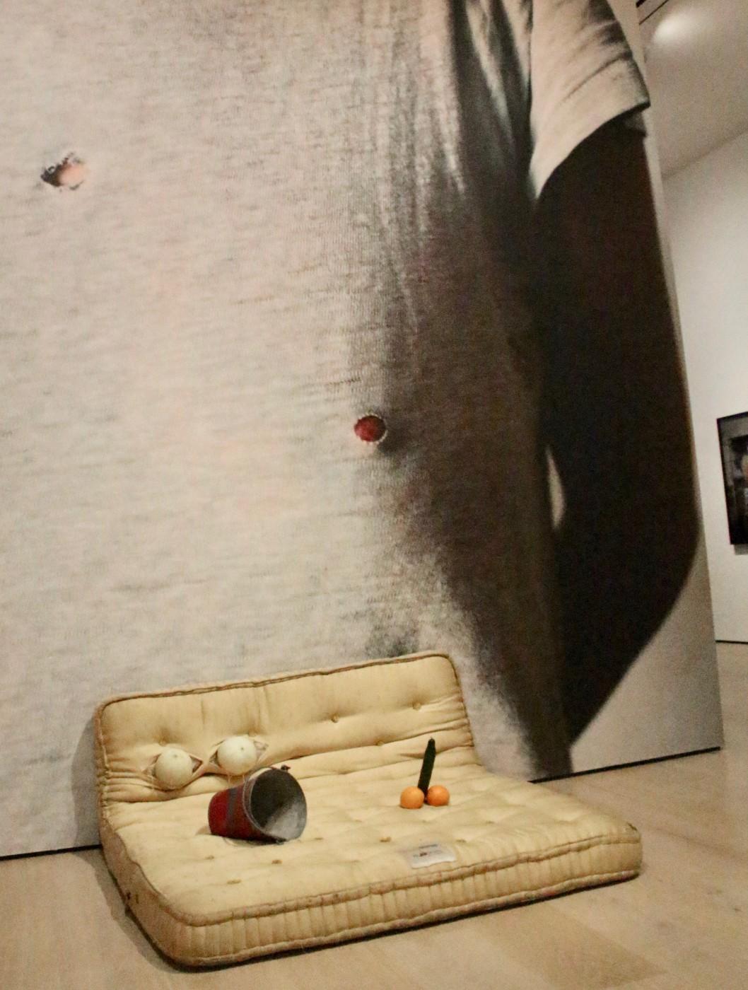 Certainly, the art world is no stranger to nudity, but when asked why she only makes the penis and testicles, Lucas cheekily replies, “Why make the whole bloke?” Erotic symbolism plays heavily into her oeuvre, which often employs food or duplicates of the real thing, as well as the real thing smeared with egg yolk as in her 2015 video Egg Massage. In it her partner, Julian Simmons lies naked on a table and is rubbed with raw eggs.
