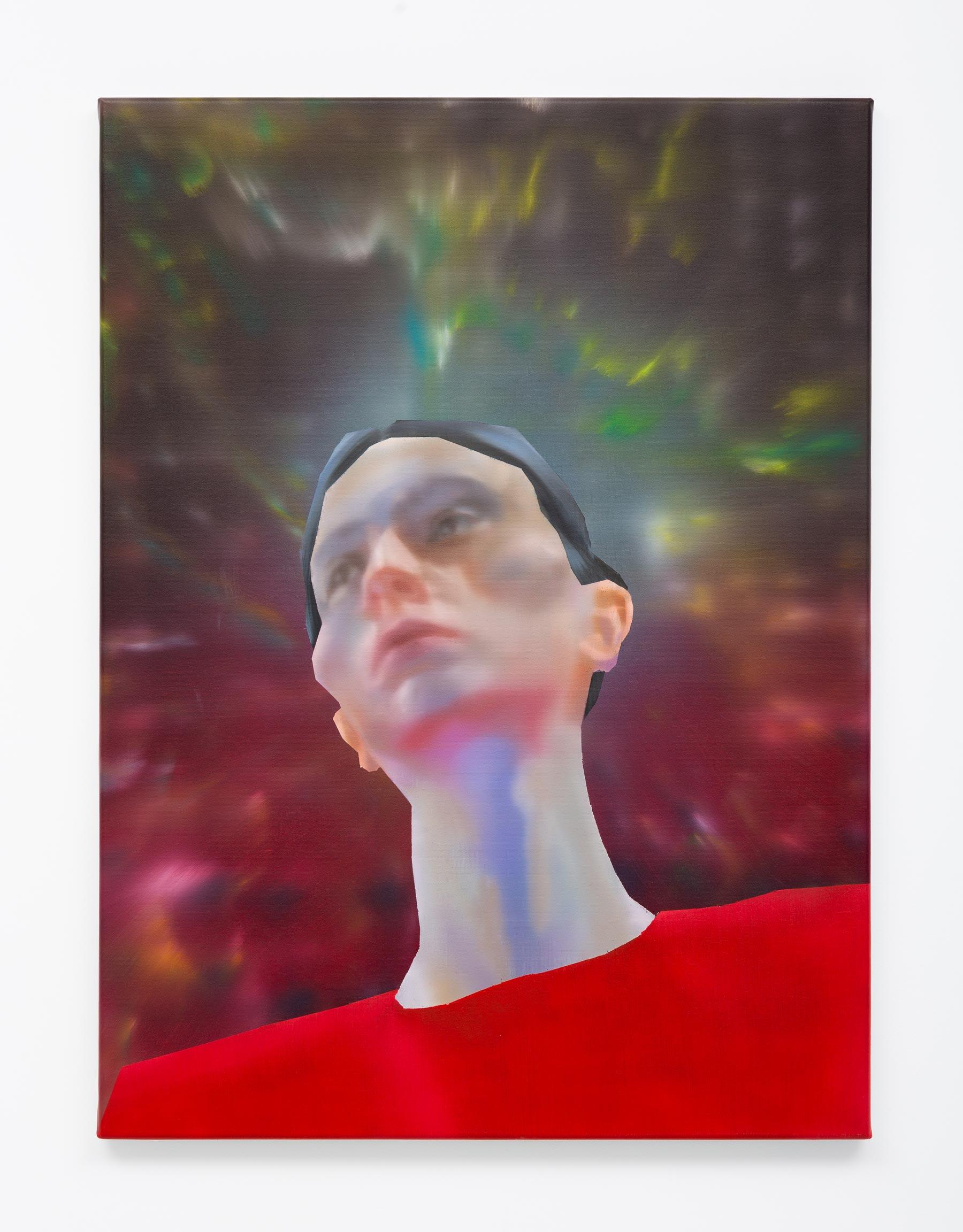 Her compelling painting Affront turns a young woman with a billowing dress into a balloon-like figure charmingly composed from comical, connected shapes. The densely painted, outlined forms pop on the monochromatic, flesh-colored ground, while the subject’s sly, side-eyed smirk suggests both embarrassment in the uncontrollable incident and offense at being improperly observed.