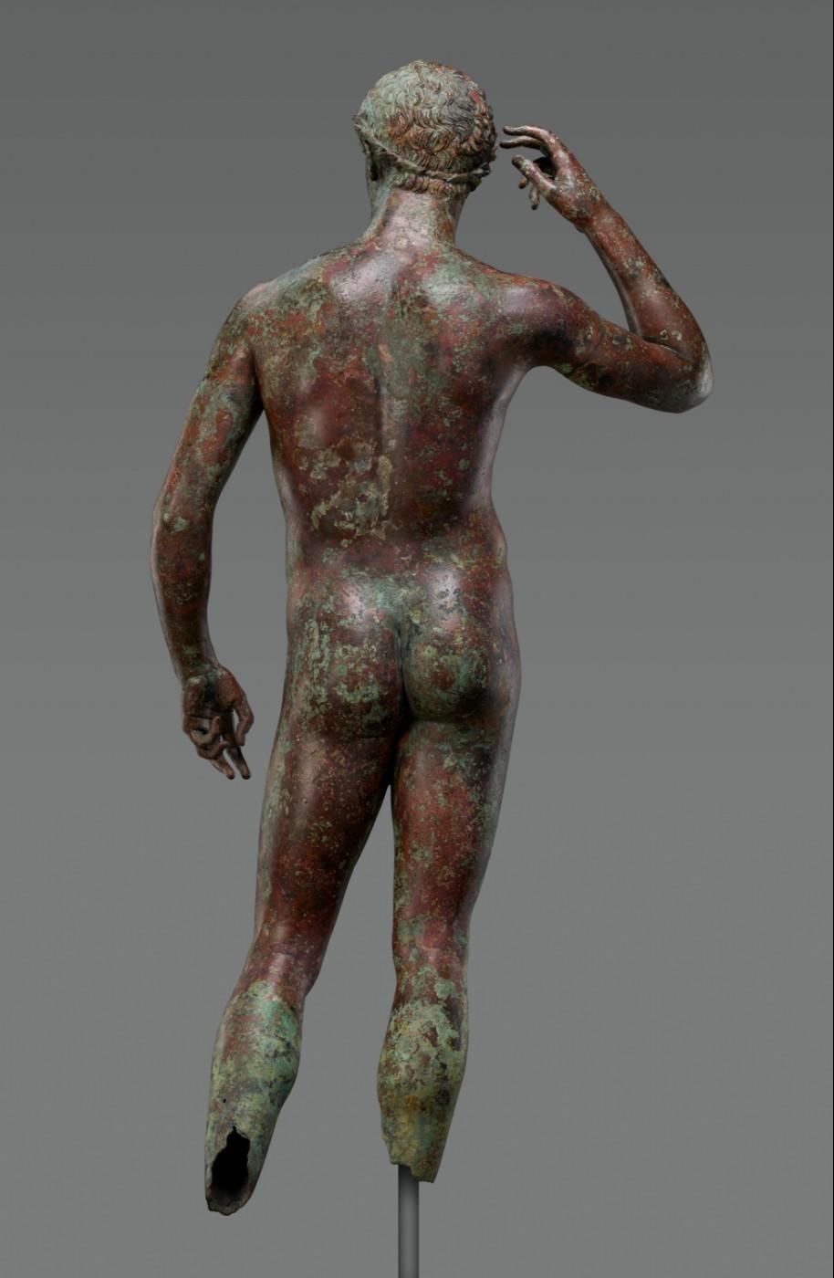 Italian fishermen hauled it aboard in their nets, encrusted in layers of barnacles and mineral deposits, and hastily sold it to local dealers, illegally flying under the radar of Italian authorities on cultural patrimony. Preserved by the sea for millennia, the statue is one of the few life-size Greek bronzes to have survived antiquity. A crucial example of the Greek mastery of the cast-bronze technique, the work is inlaid with copper and would have originally had stone or glass inlay details.