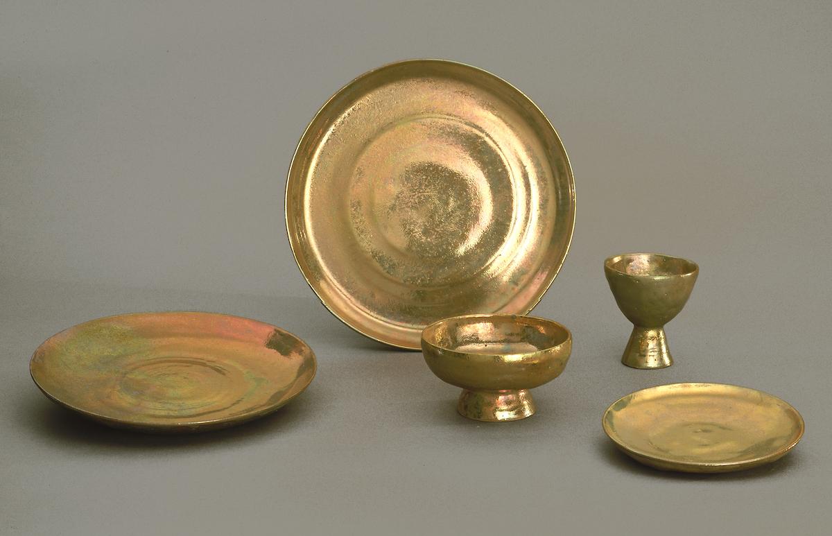 Place Setting from Service for Twelve; 1972–73; Designed and made by Beatrice Wood (American, 1894–1998); Thrown luster-glazed earthenware; Gift of Mark Del Vecchio and Garth Clark, 1986-23-1/5.