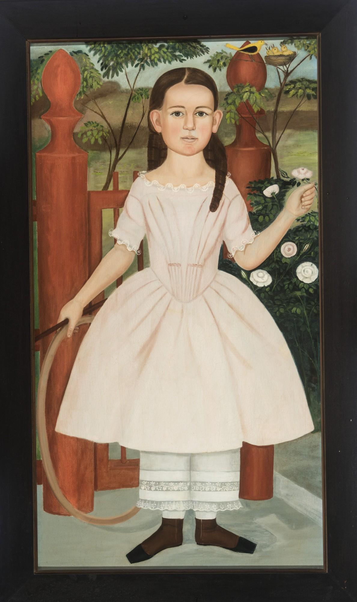 In a pre-modern medicine era, portraiture served as a way to document the often fleeting lives of Americans. Child mortality rates were high, and it was not uncommon to lose multiple children early in their lives. Bereaved parents who had the means would honor their lost children through portraiture. Samuel S. Miller shows a healthy Cynthia Mary Osborn in his portrait, ready to play in the yard with her hoop, though the presence of goldfinches, flowers and trees symbolize death and mourning.