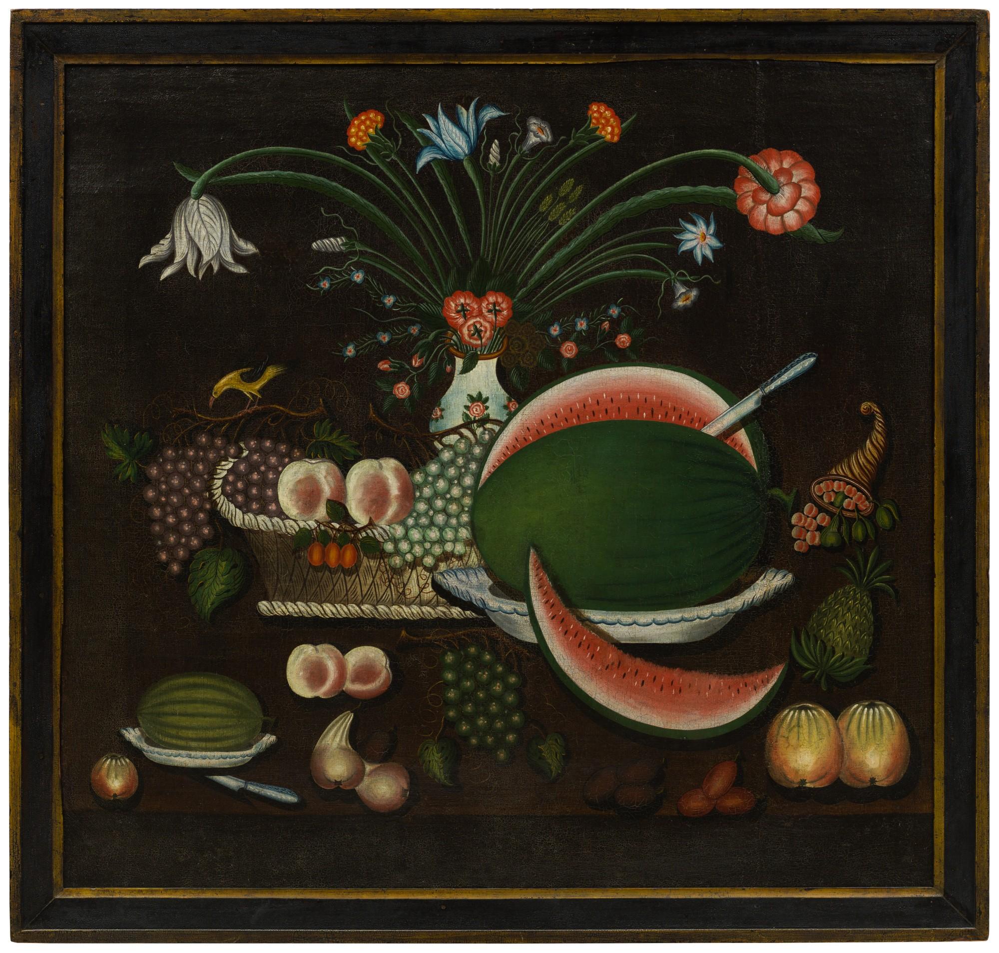 Americans are known for their resilience and resourcefulness, and despite difficult times, folk art often shows the joys and simple pleasures of life in a new country. A 19th-century still life shows the bountifulness of the land of plenty. Painted by John Proctor, an African-American artist, the painting is a reminder that despite conflicts, America has still been a land of opportunity. Set against a dark background, a juicy watermelon and glistening grapes entice us, as do the colorful stylized flowers. But like traditional Dutch vanitas, this still life is a reminder of our mortality, as all of these fruits will rot, and the goldfinch is a symbol of the resurrection.