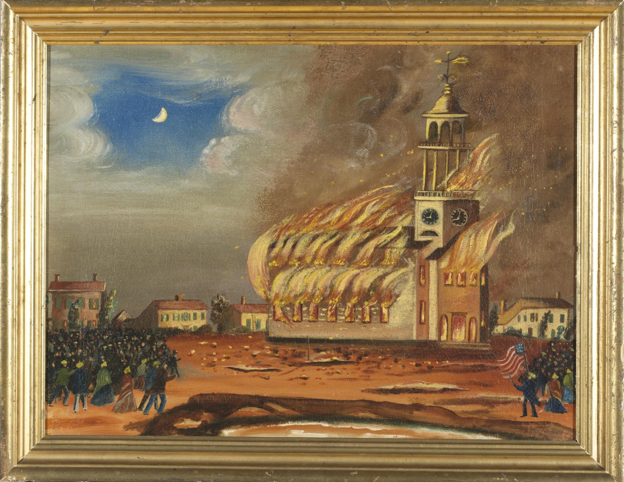 Attributed to John Hilling (American, 1822-1894), The Burning of Old South Church in Bath, Maine, c. 1854. Oil on canvas. Jonathan and Karin Fielding Collection.