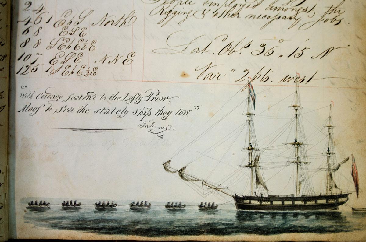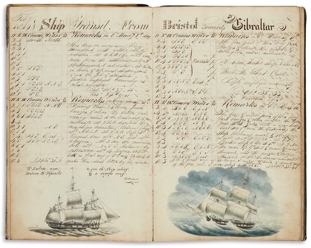 At auction last week in New York was a bound volume containing two early nineteenth-century ship’s logbooks, “Journal of a Voyage, from Bristol to the Mediterranean, Anno Domini 1819” and “Log-Book Kept on board the Astraea On a Voyage from London to the Mediterranean, Anno-Domini 1821.” Unlike many logbooks of their kind, these two displayed exceptional artistic merit, containing 28 leaves of ink calligraphy (page headers) and 35 fine watercolor drawings. Their creator, Captain William Hodgson, drew not only his own ships but other trading vessels traveling through the Mediterranean at the time.