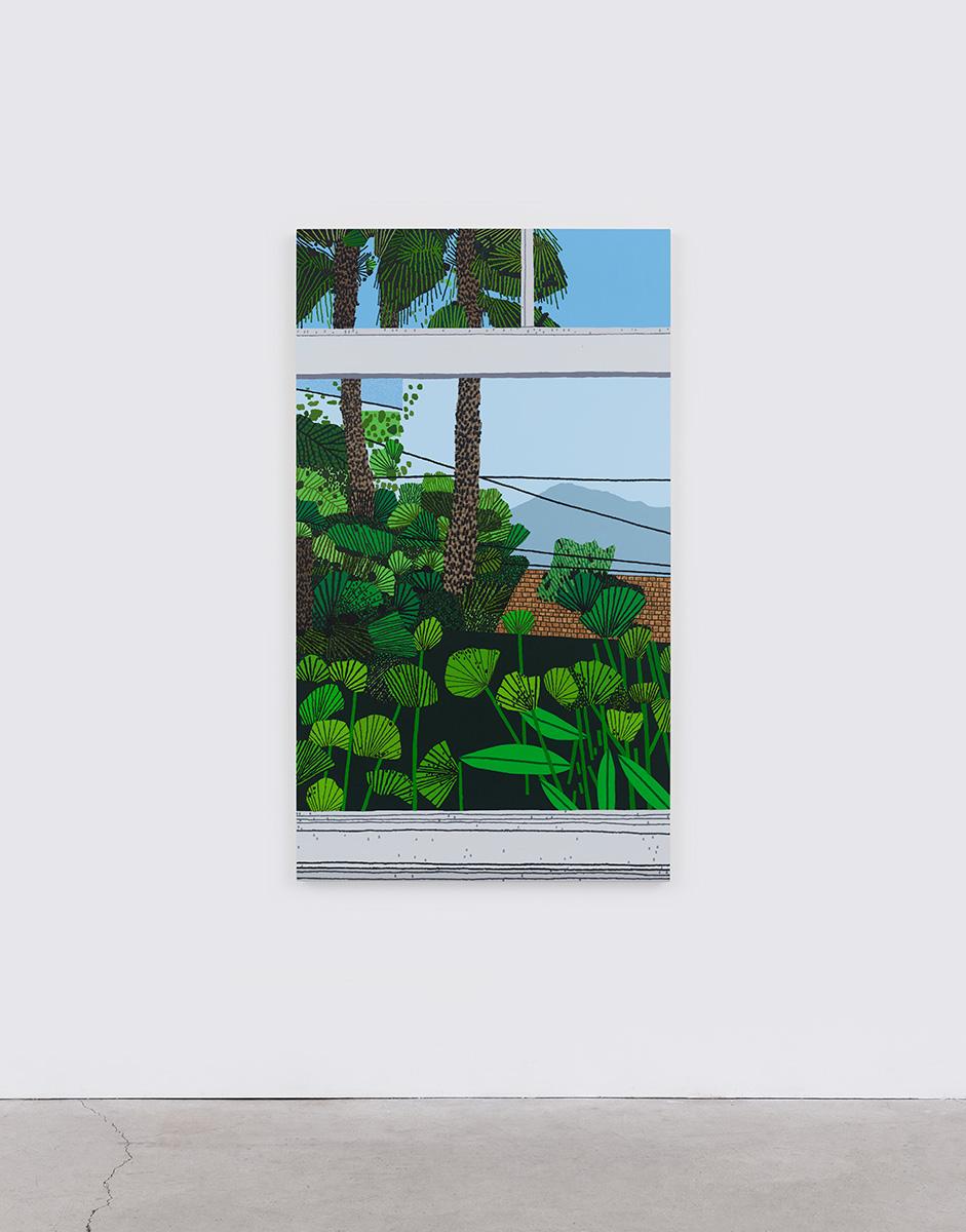A dog named Robot, Wood’s scrappy-looking terrier mix featured often in past works, died last year and is not among the canines seen here. Instead, most were found on Instagram. A trio accompanies his wife, artist Shio Kusaka, in Shio with Three Dogs, a composition dominated by a large mastiff with a shaggy mane. Nearby, hang three gouache, pencil, and ink studies.
