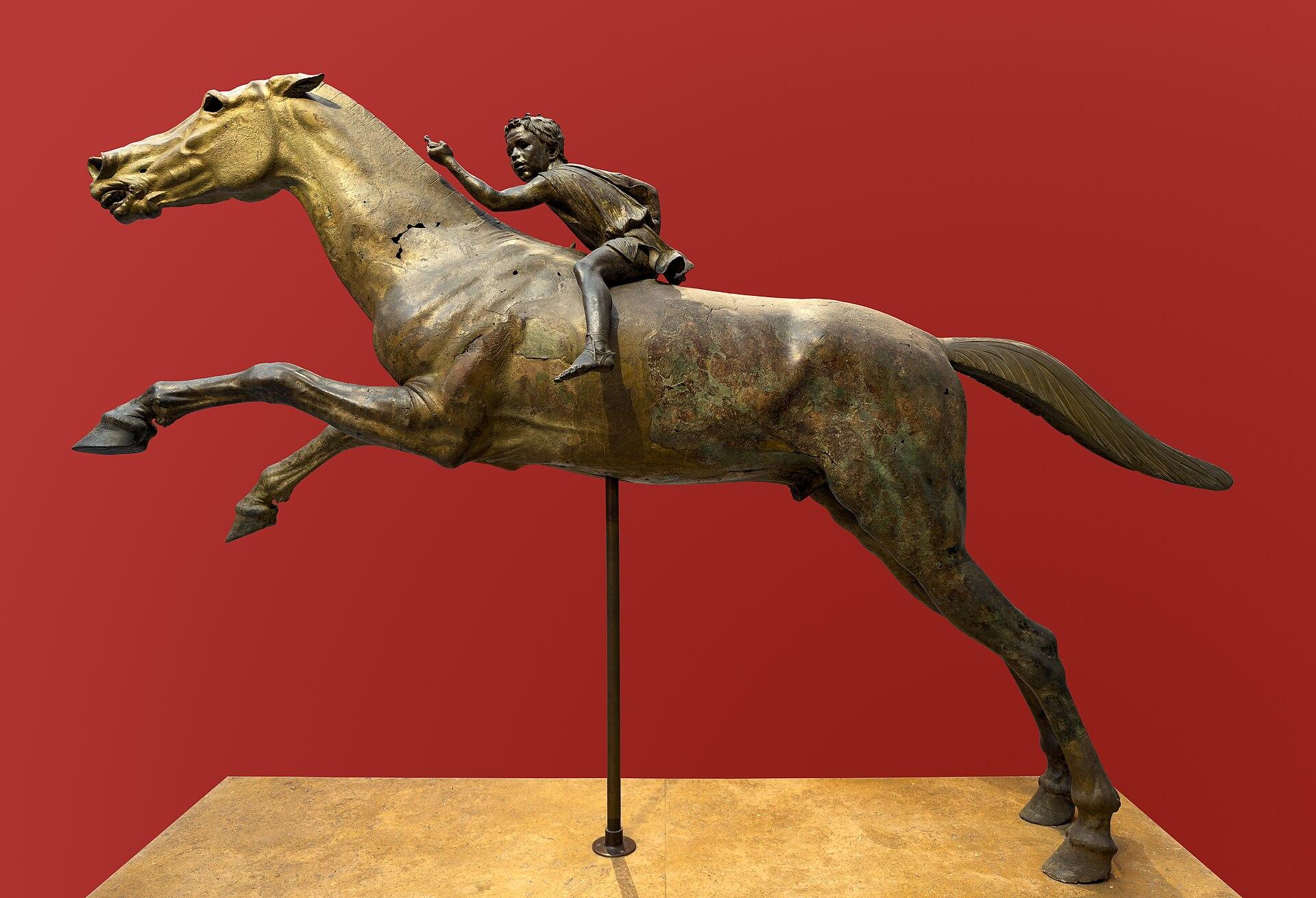 The Jockey of Artemision is a life-size bronze sculpture in the round, dating to 150-140 BCE. The artist is unknown. Currently housed in the National Archaeological Museum of Athens. License